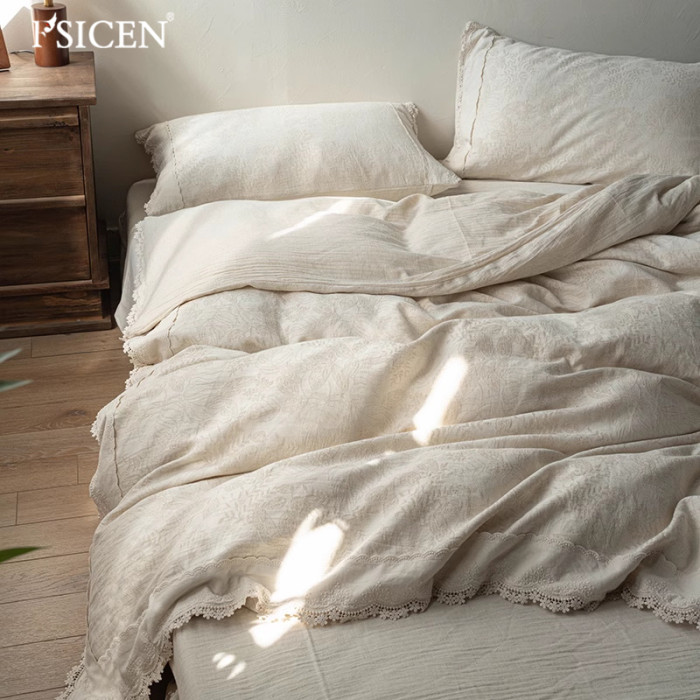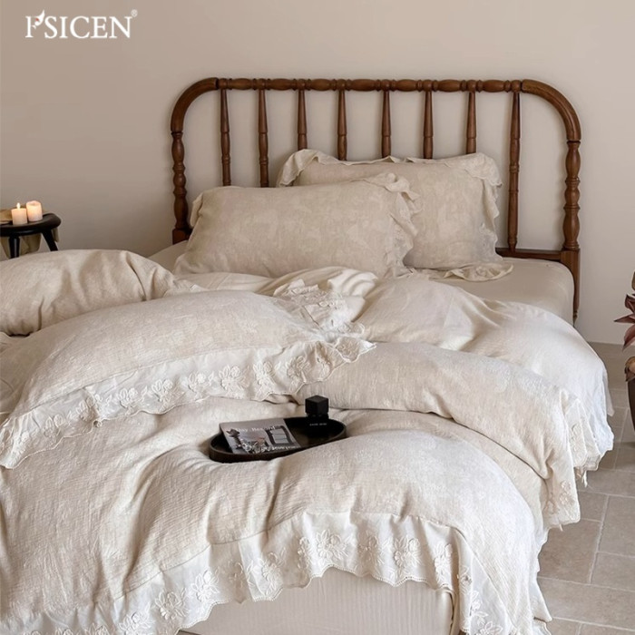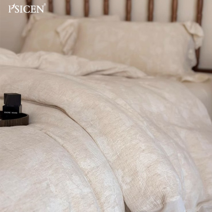 富士晨秋季提花蝴蝶棉麻本色四件套麻棉花邊被套床單柔軟透氣床品