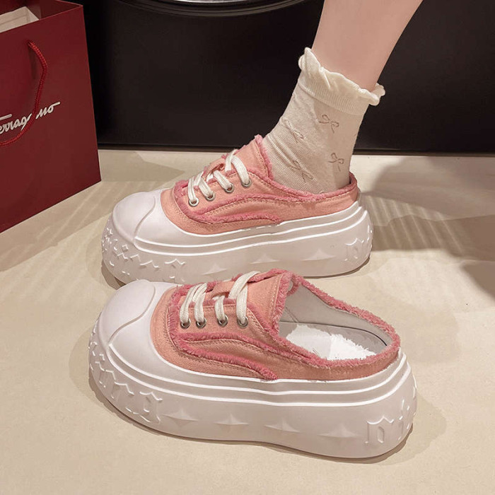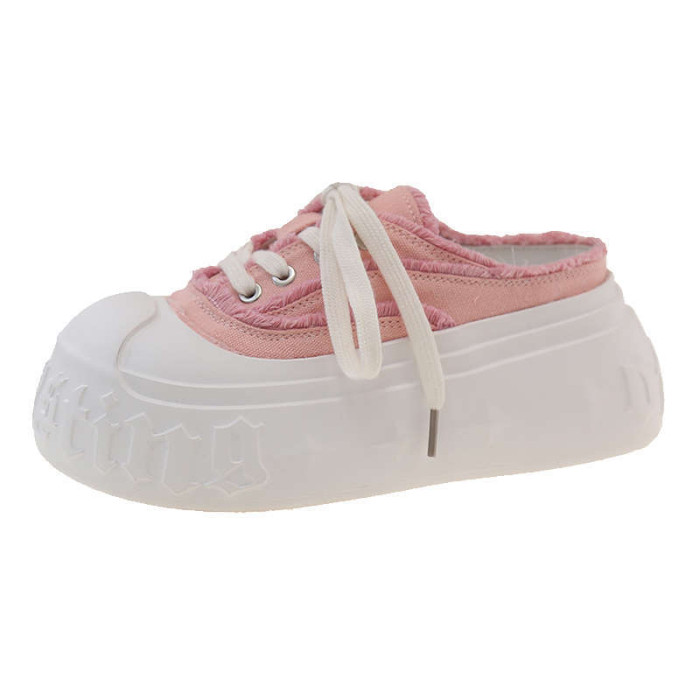 時尚休閒松糕醜萌大頭麵包鞋女2025春夏歐貨厚底乞丐帆布包頭半拖