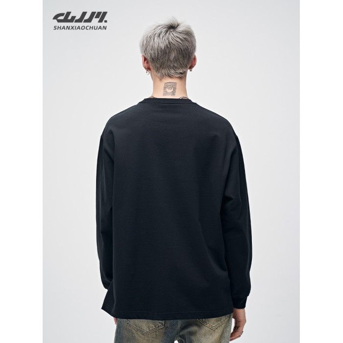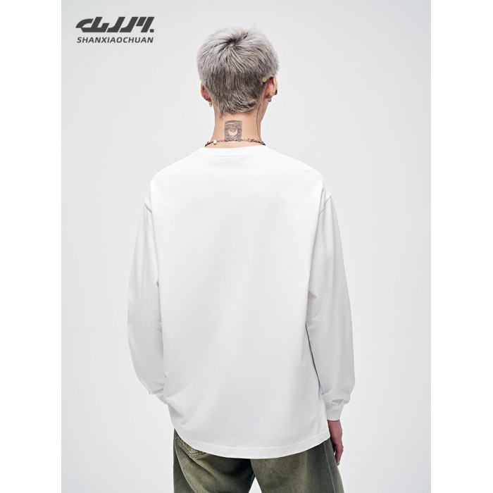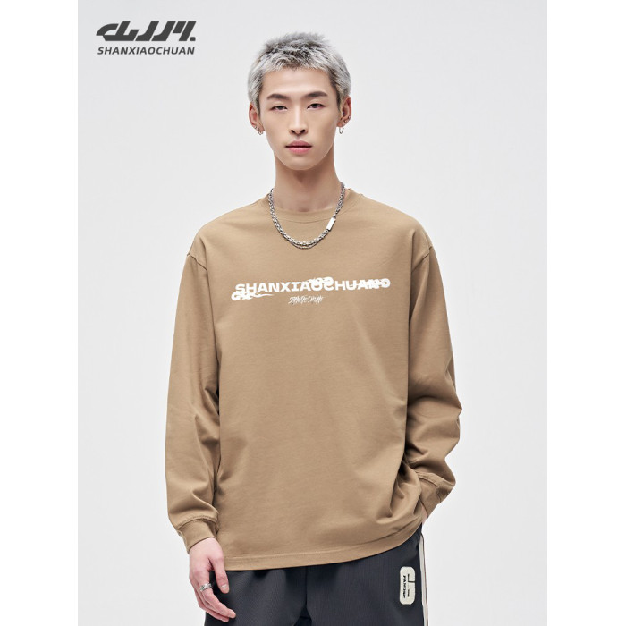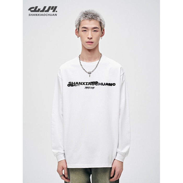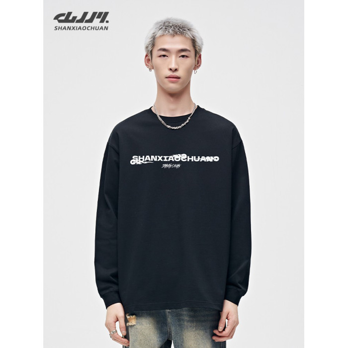 山小川潮牌印花圓領男t恤長袖純棉春秋季美式寬松男生打底衫