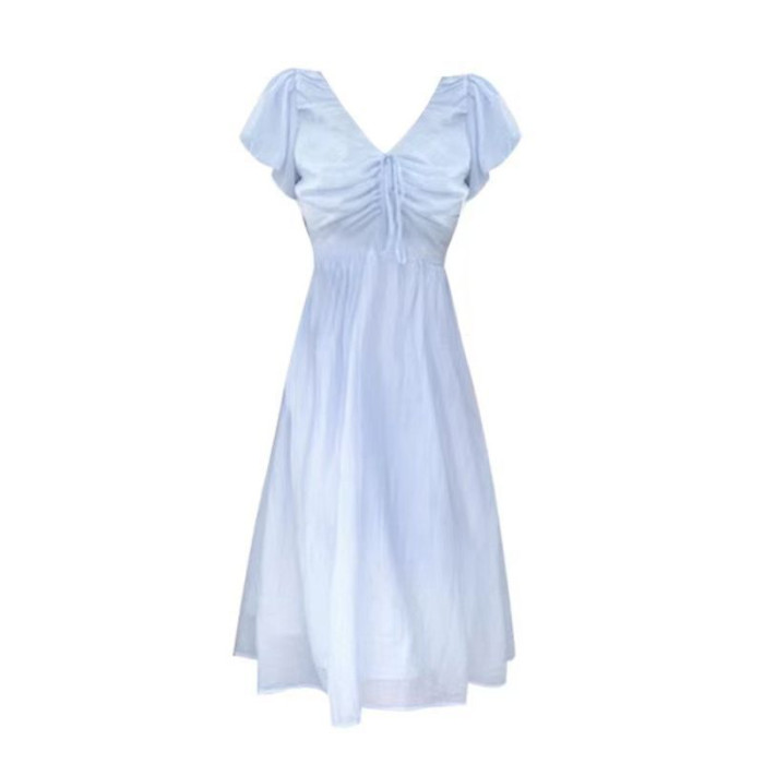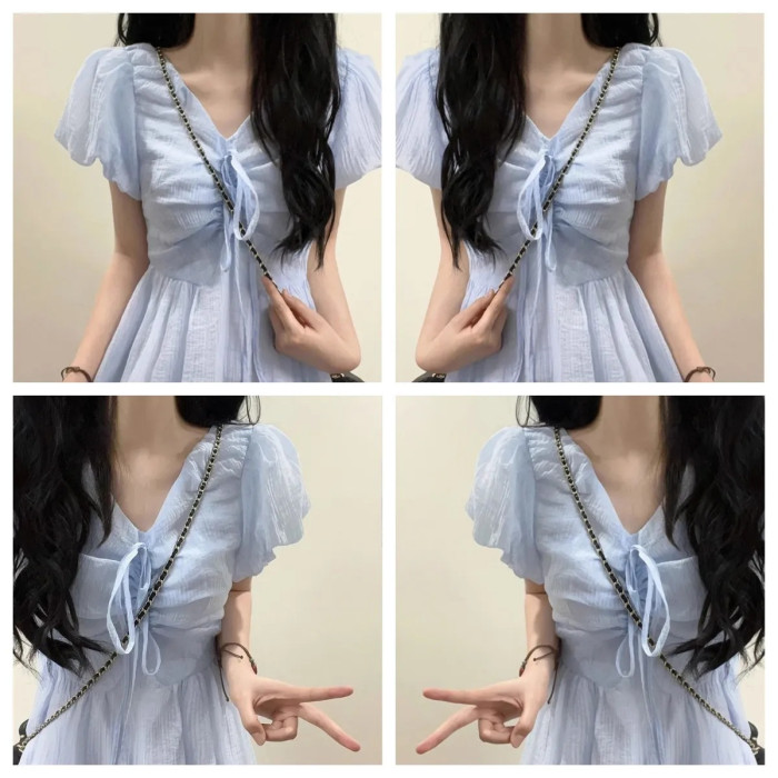法式文藝系帶V領藍色泡泡袖連衣裙子小個子超仙女收腰顯瘦長裙子