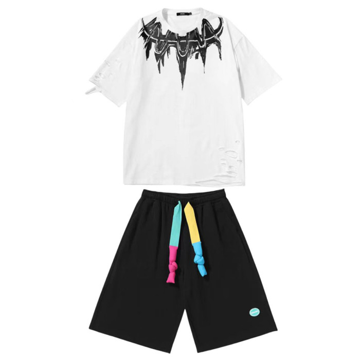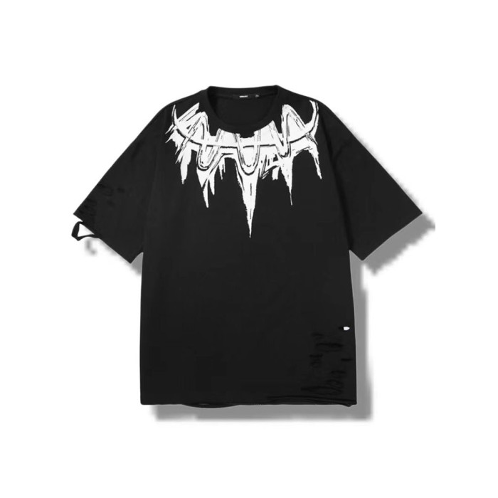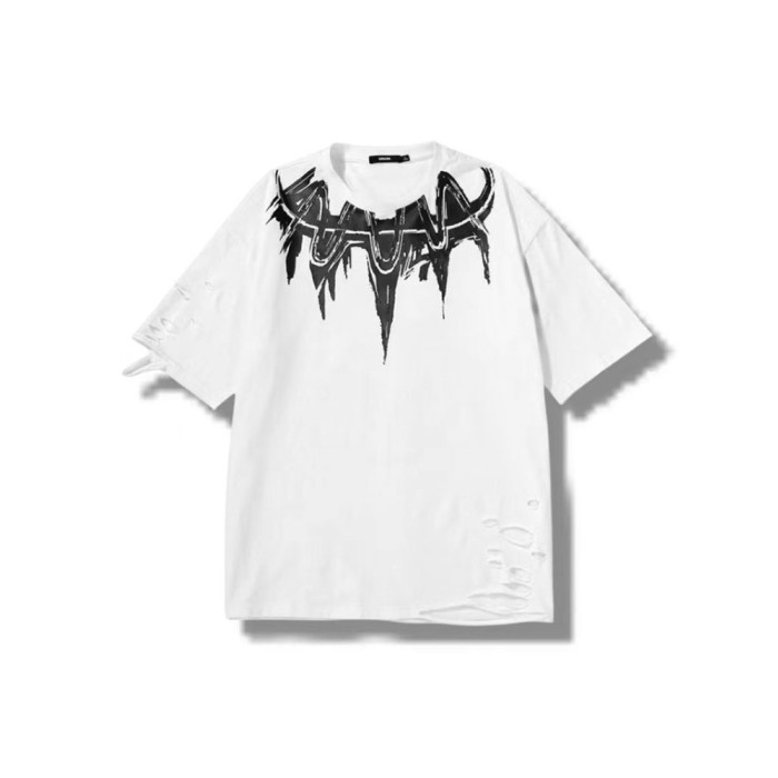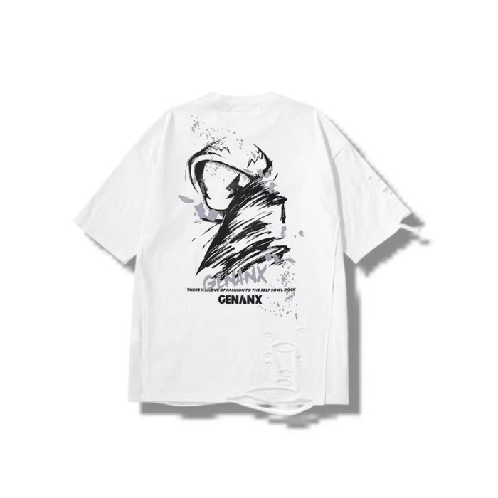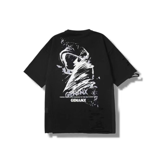 GENANXTX閃電潮牌抽象塗鴉閃電裙夜光印花破洞卷邊網布男t恤夏季