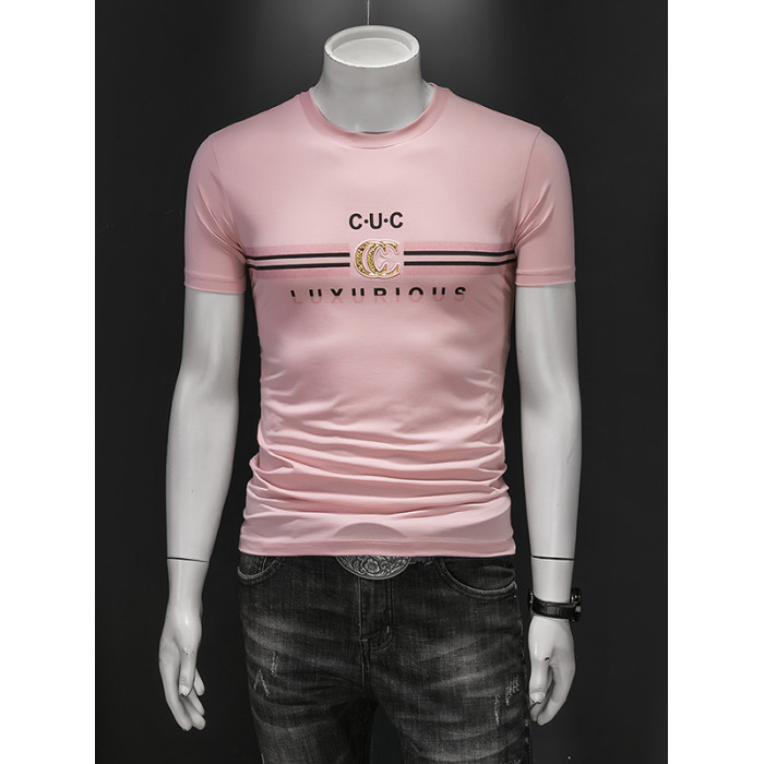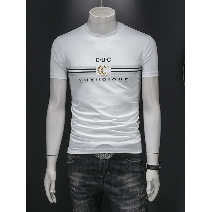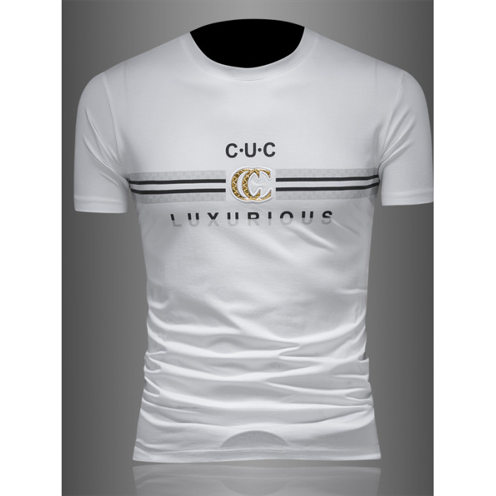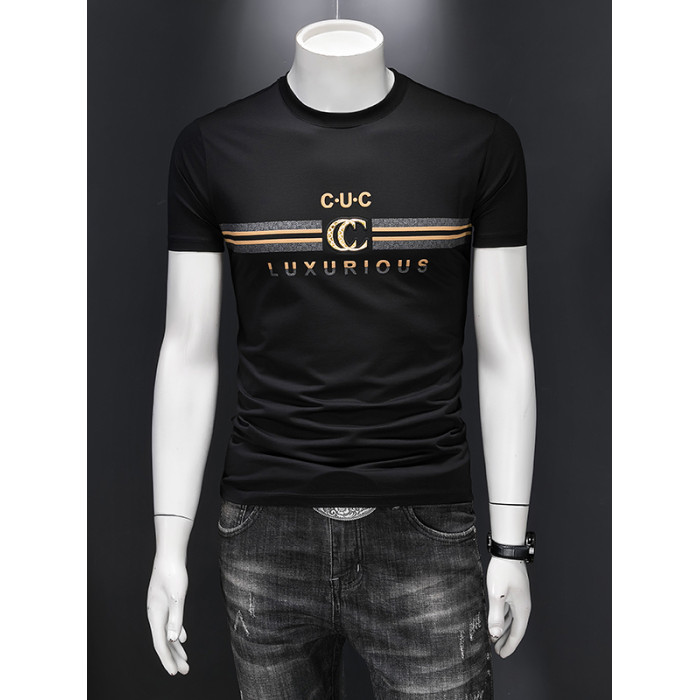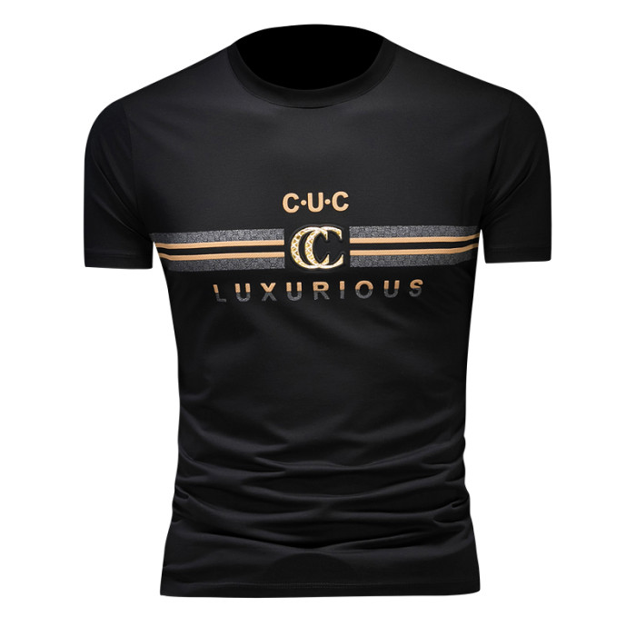歐貨短袖T恤男夏季圓領修身印花燙金高檔絲光棉薄半袖男t恤歐洲站
