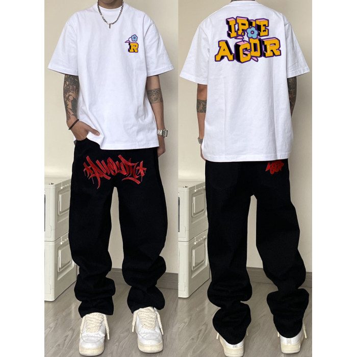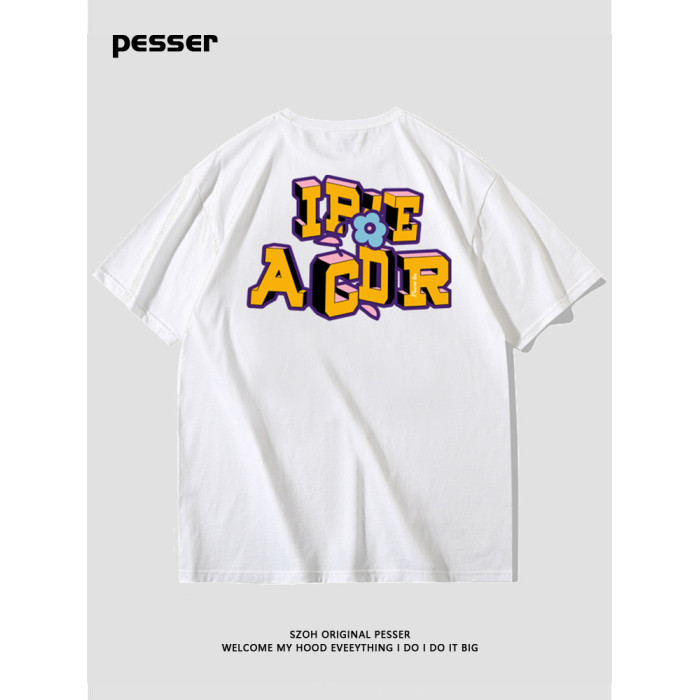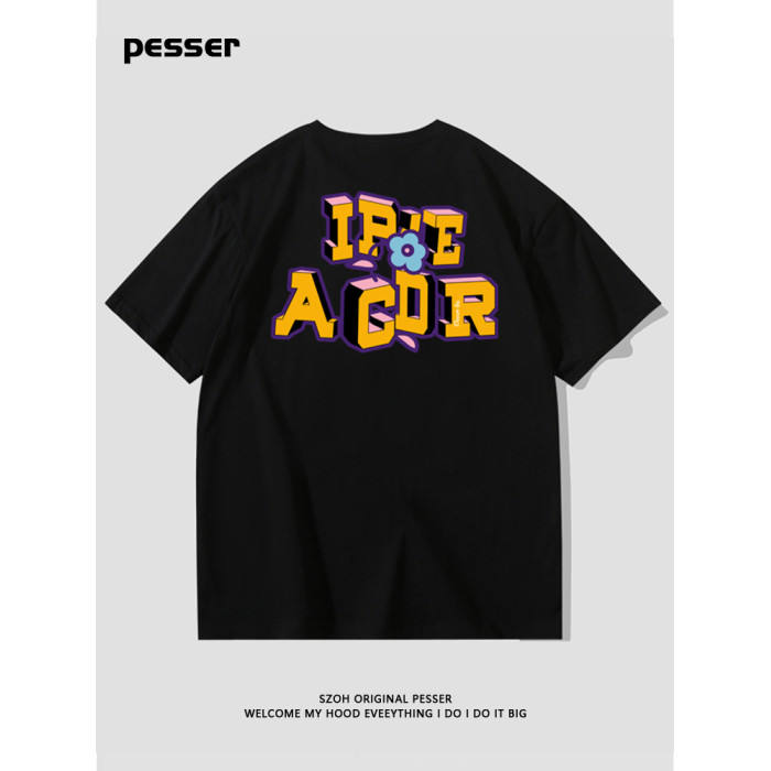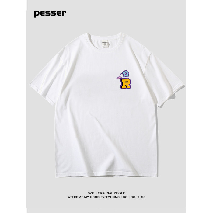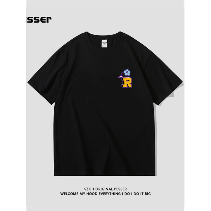 ins國潮牌小衆前後設計感小花字母印花重磅純棉短袖男t恤寬松上衣
