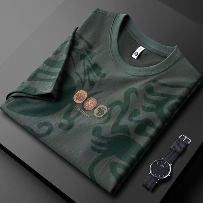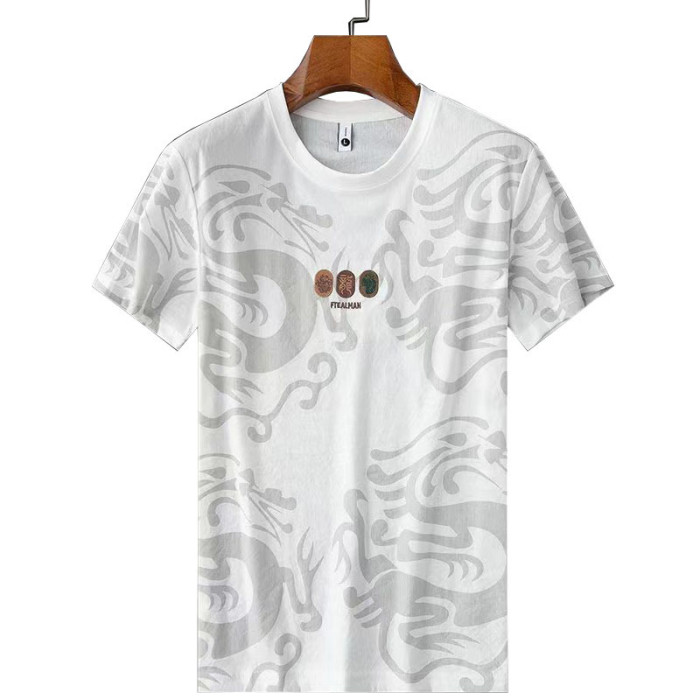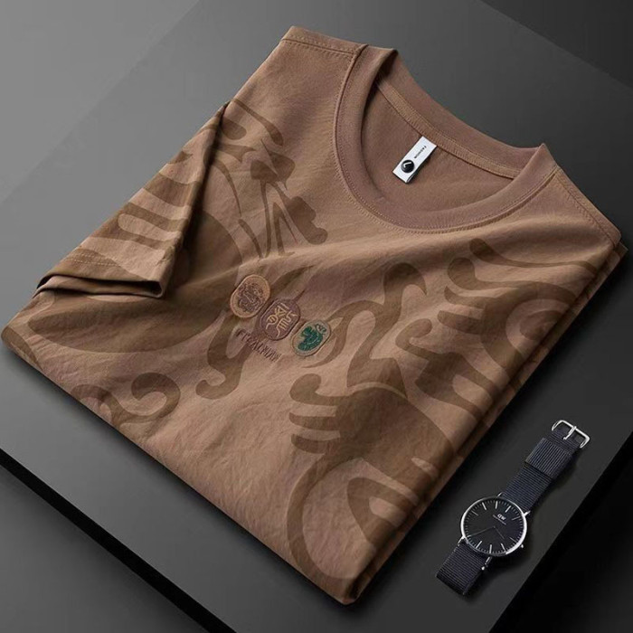輕奢夏季短袖t恤男青年高品質修身圓領仿亞麻薄款刺綉印花男t恤