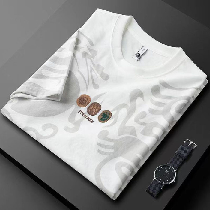 輕奢夏季短袖t恤男青年高品質修身圓領仿亞麻薄款刺綉印花男t恤