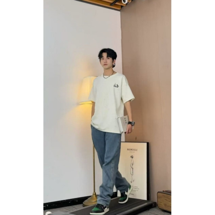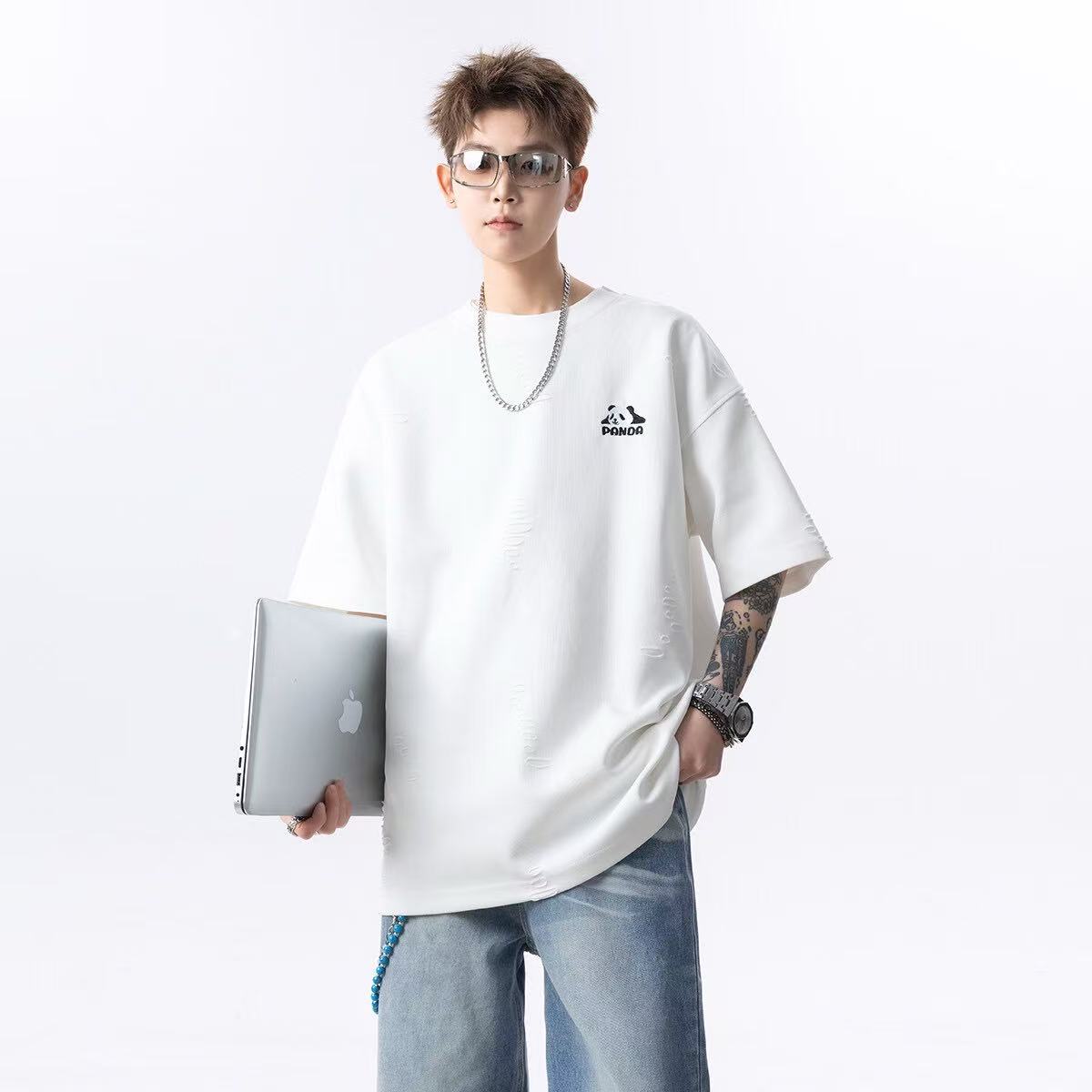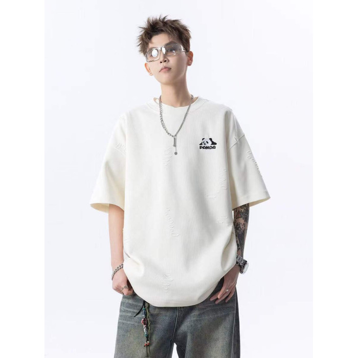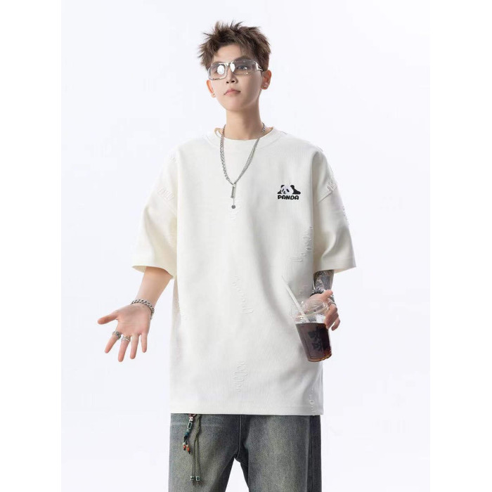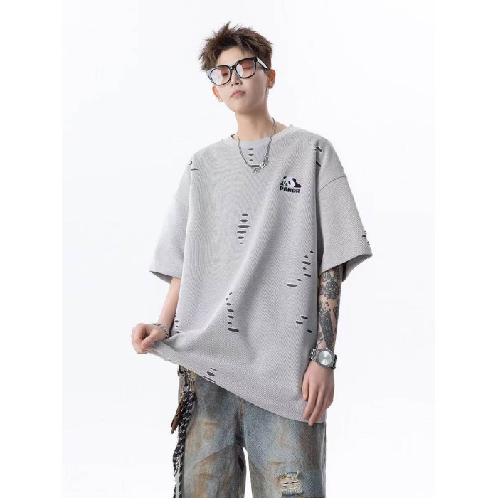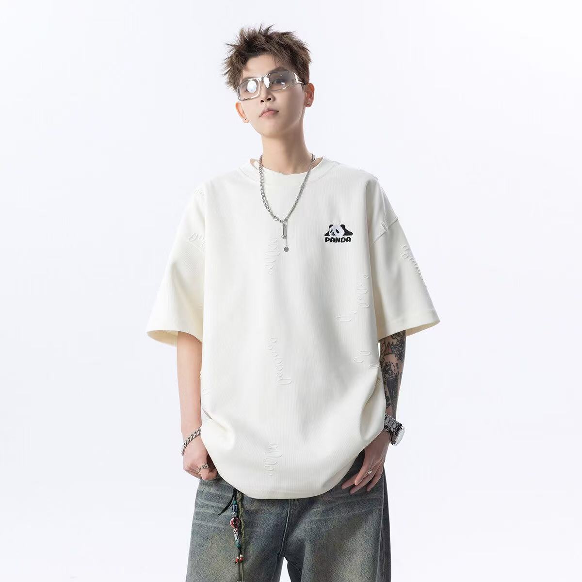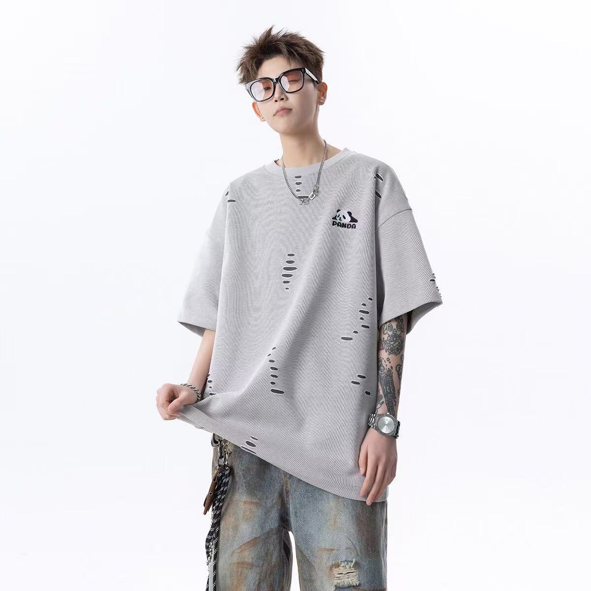 大雄小個子穿搭日記2025美式純色破洞冰感短袖寬松熊貓印花男t恤