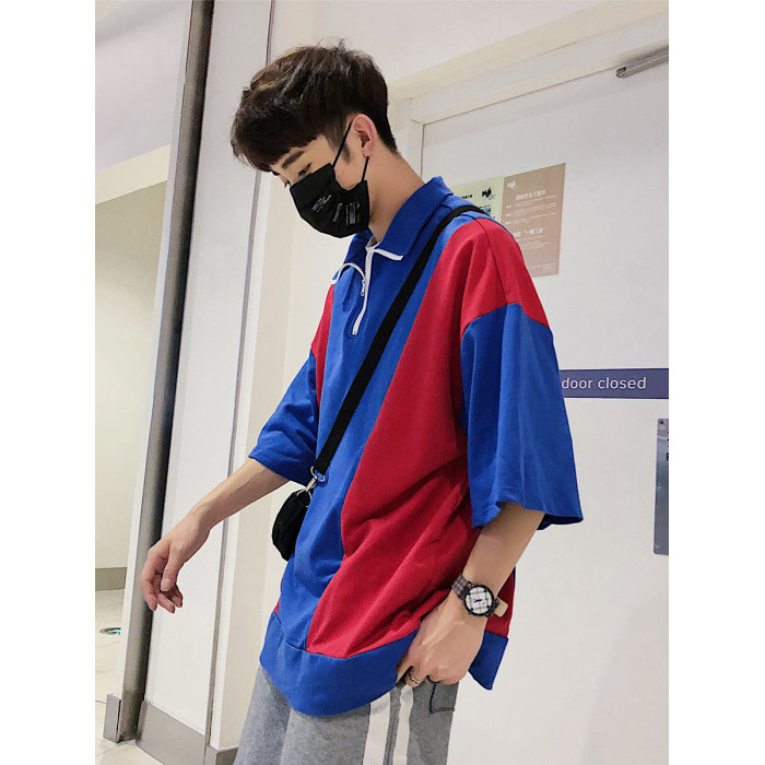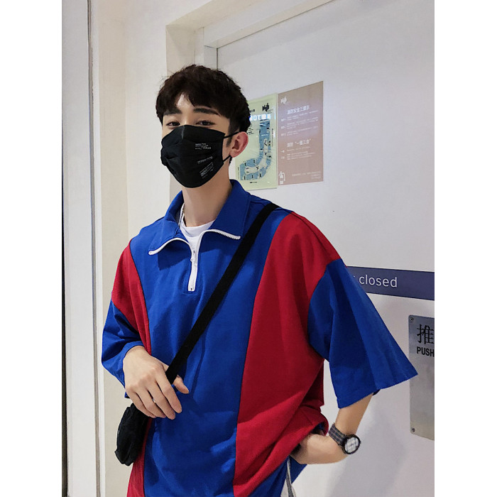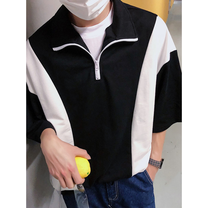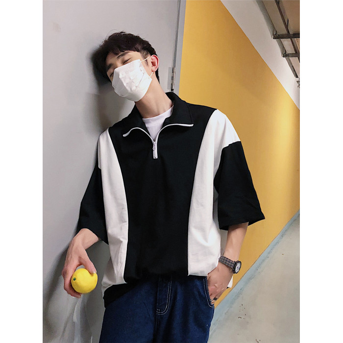 polo衫拉鍊短袖男t恤上衣女寬松bf風半高領拼接撞色嘻哈潮流夏季