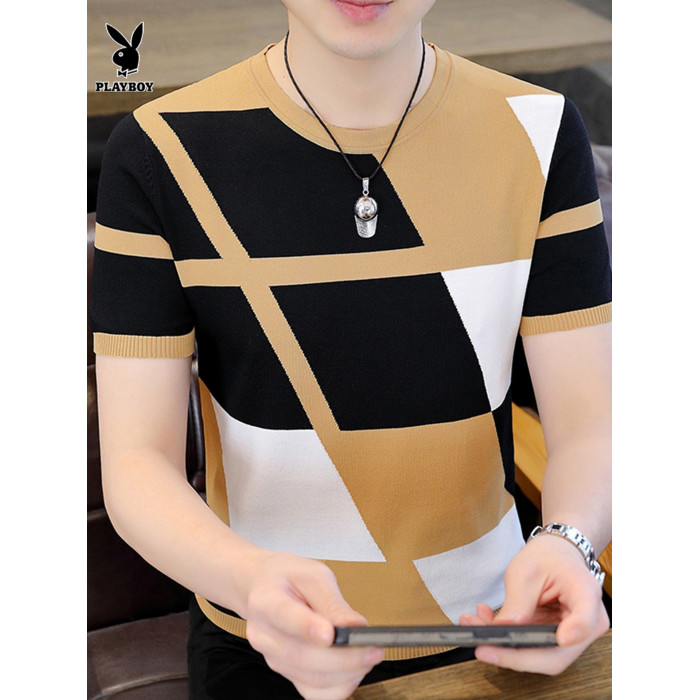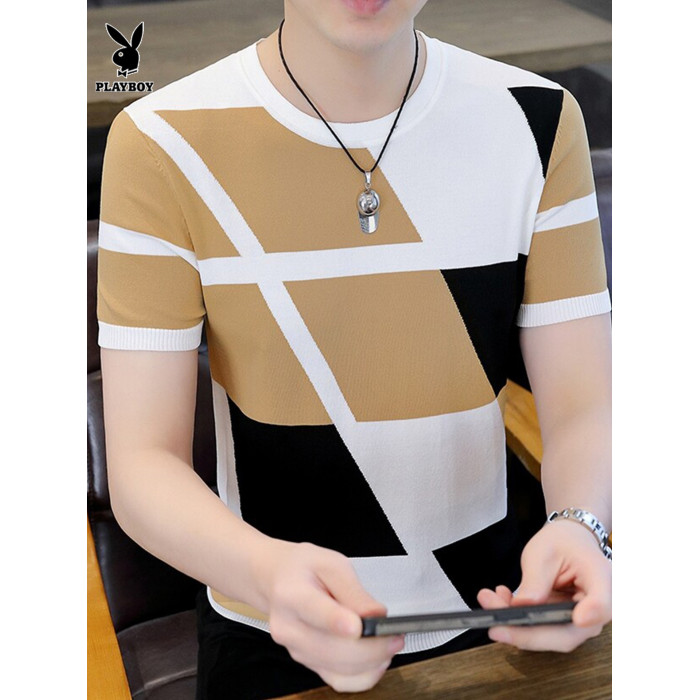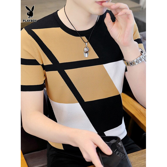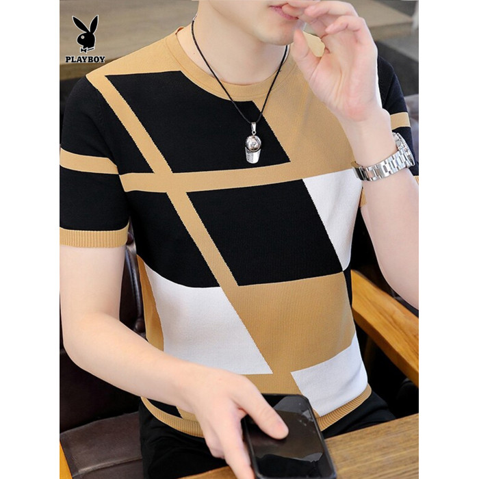 花花公子潮流圓領針織短袖男t恤2025夏季新款高級時尚男士冰絲t恤
