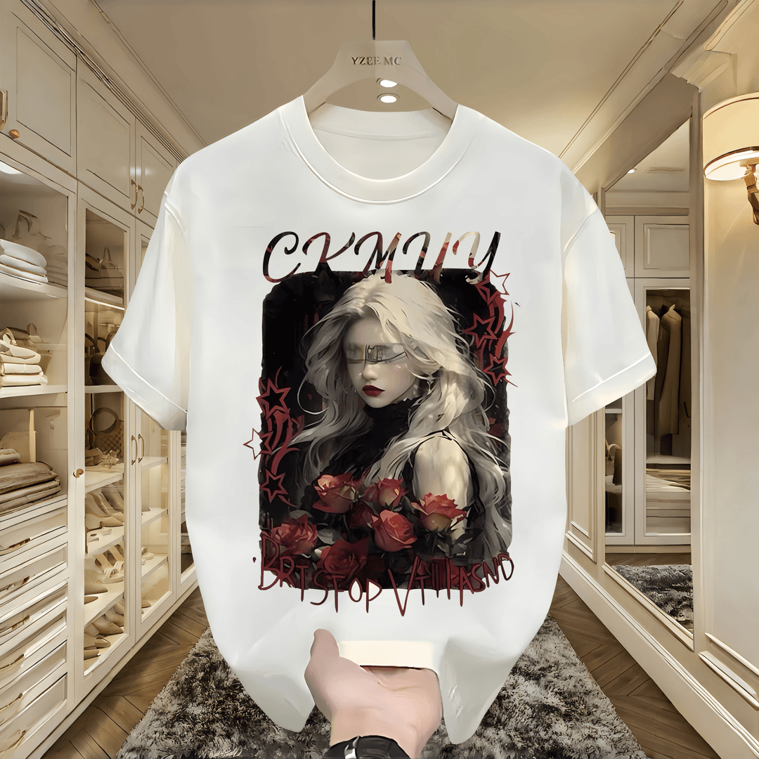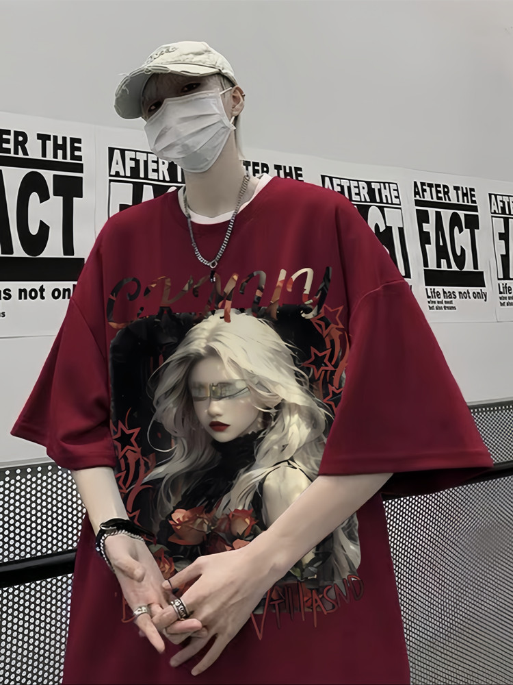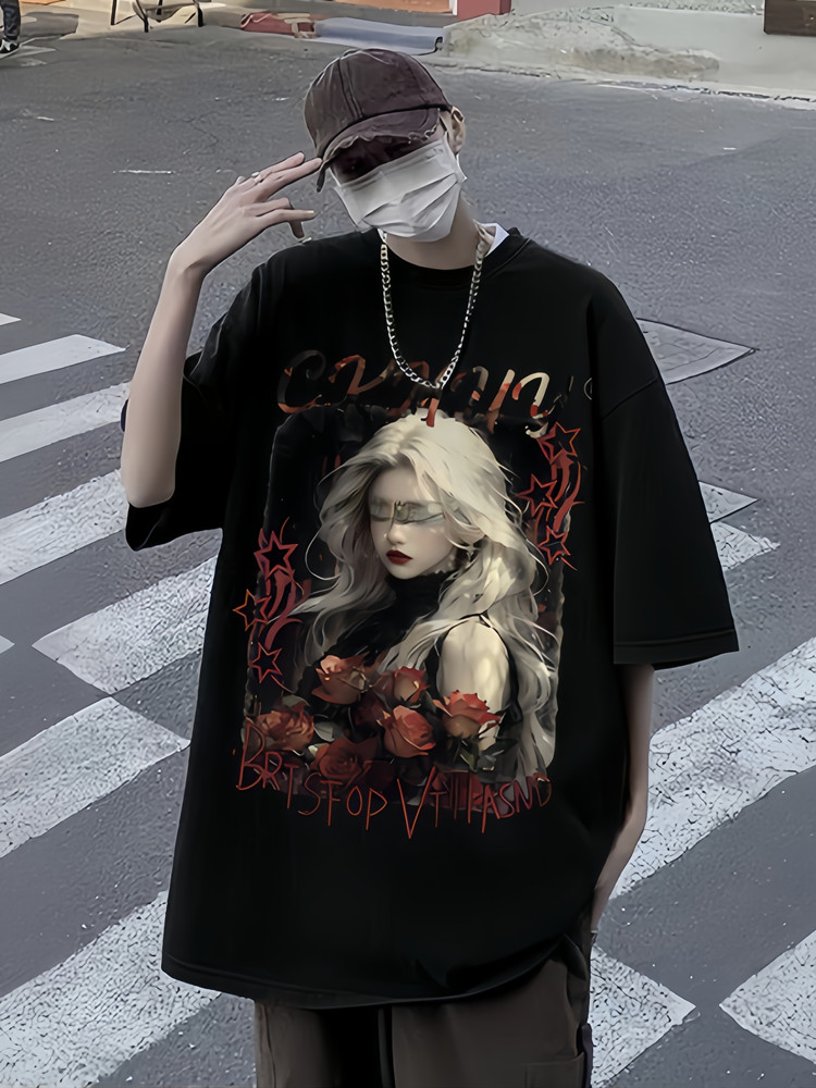 潮牌美式復古重磅純棉短袖t恤男直夏季休閒寬松大碼人物印花百搭