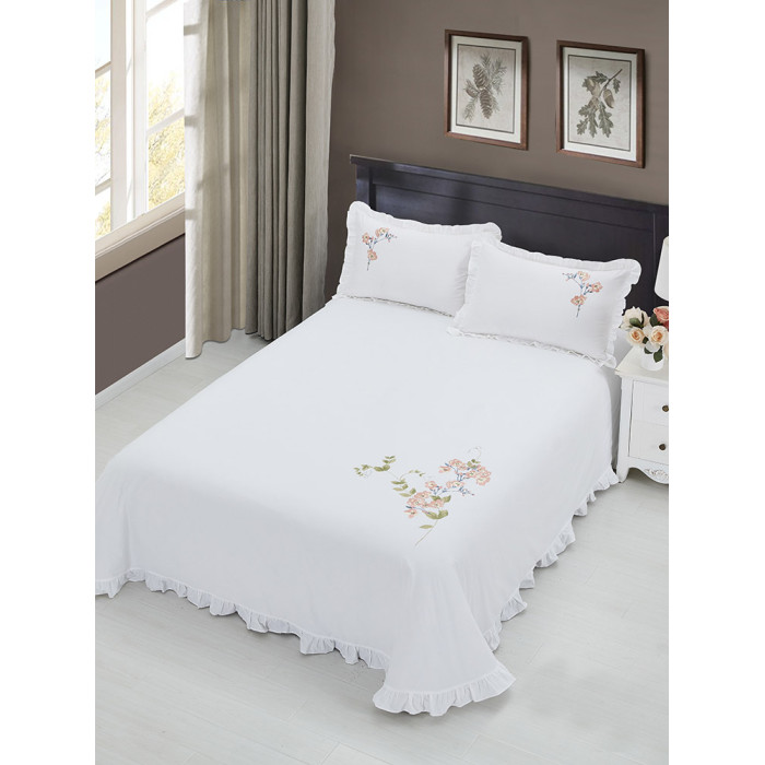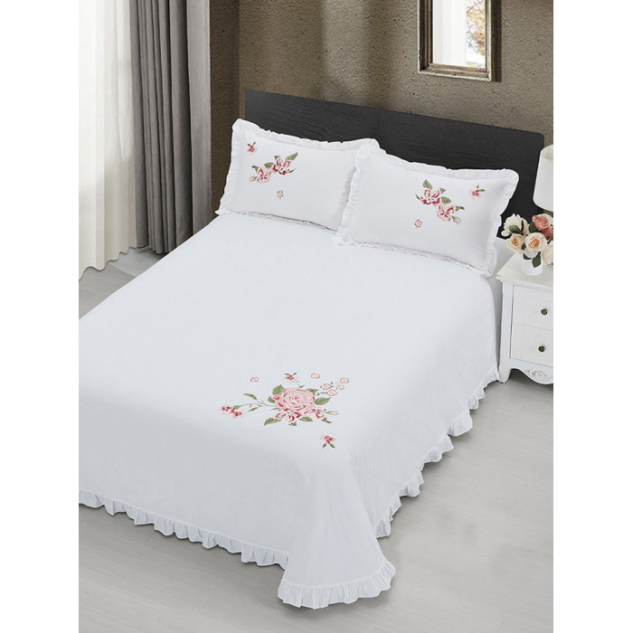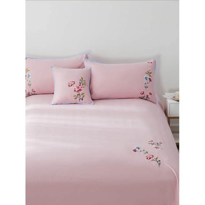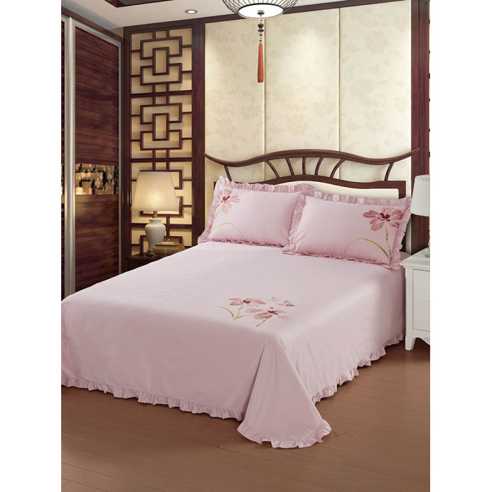 大床單單件純棉100全棉刺綉荷葉邊高級粉色雙人三件套四季通用