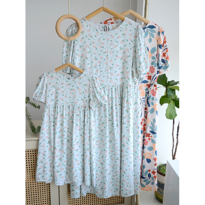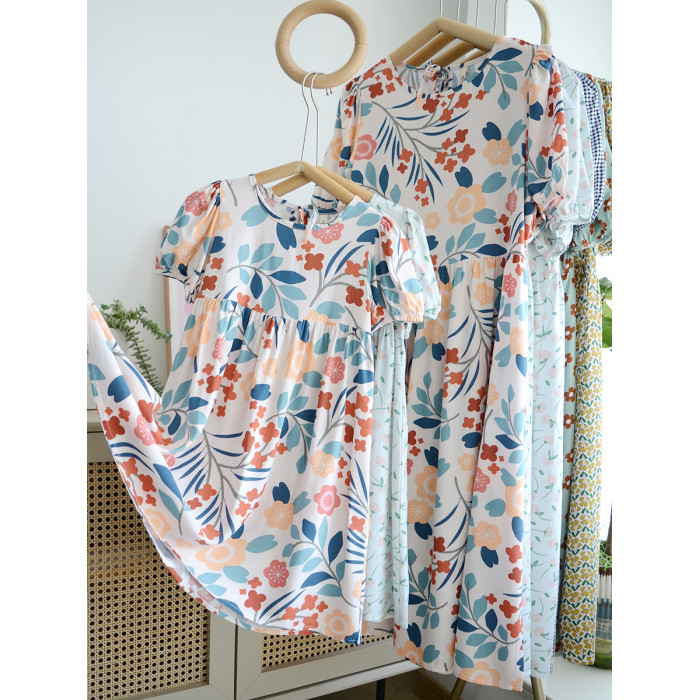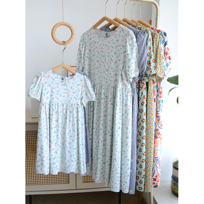 親子裝夏季人造棉裙子兒童夏裝棉綢短袖女童寶寶時髦度假風連衣裙