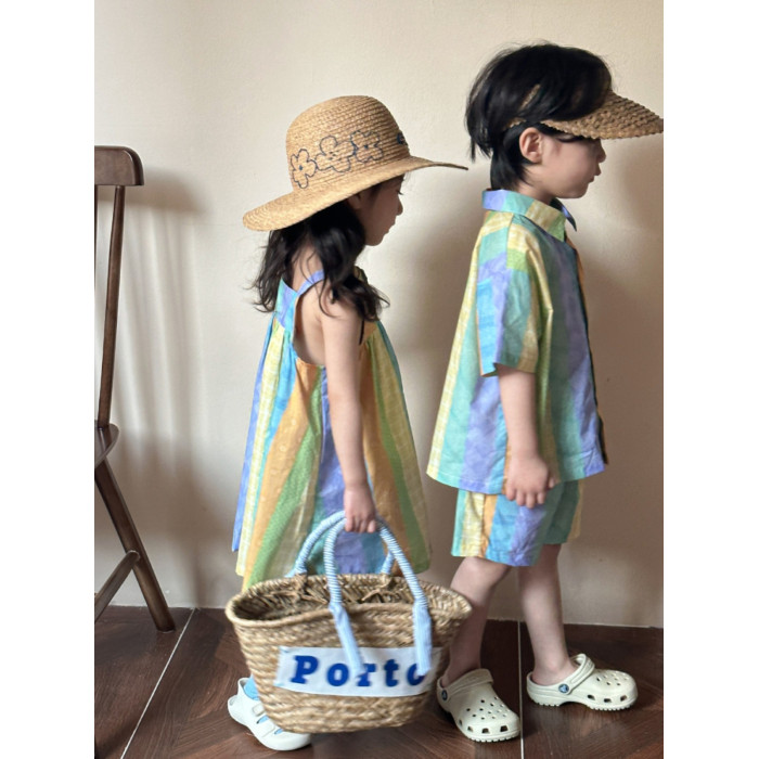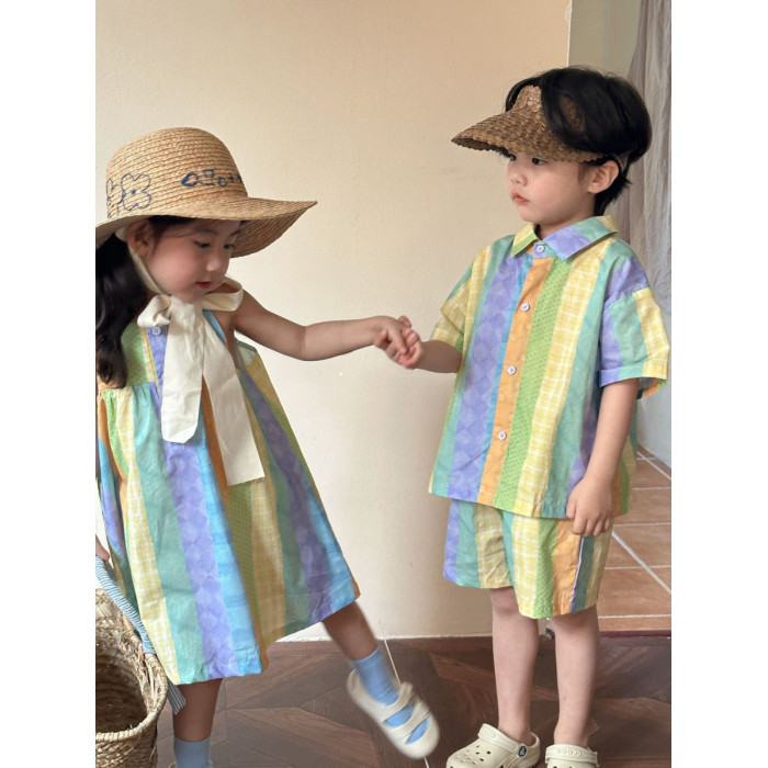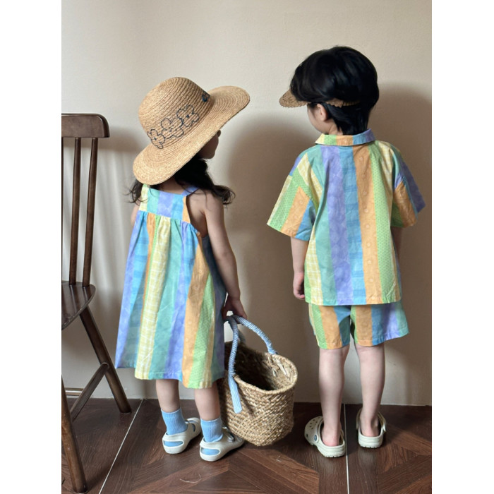 2025新款兄妹裝兒童夏季短袖男女童裝親子裝姐弟裝吊帶裙純棉套裝