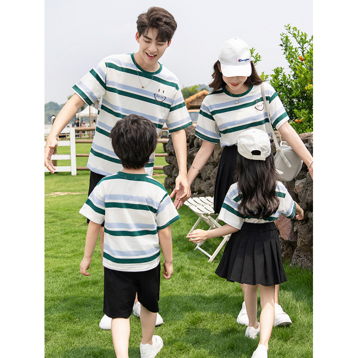 親子裝2025新款夏天一家三口四口短袖t恤母女裙套裝條紋家庭夏季