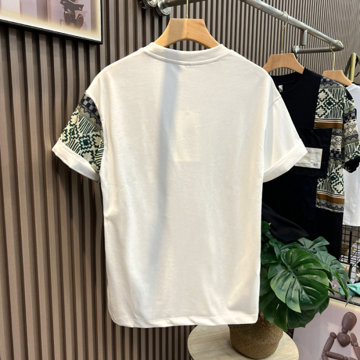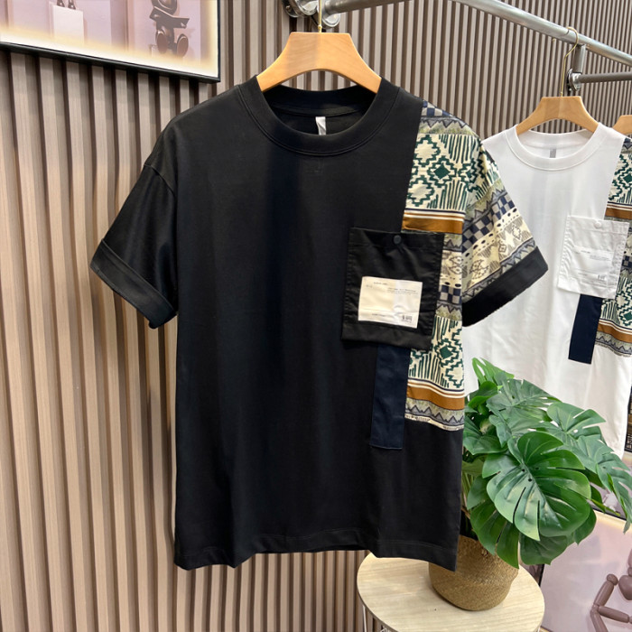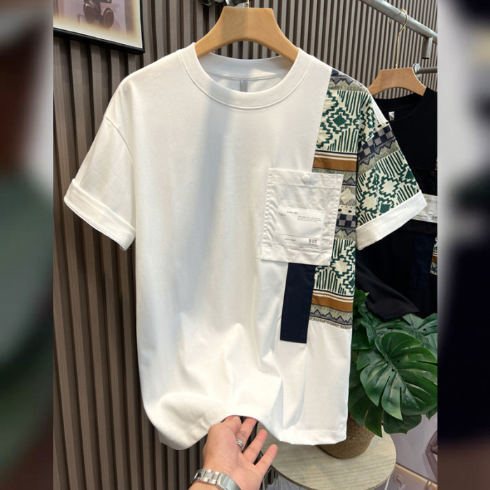 夏季新款時尚拼接短袖男T恤工裝風休閒圓領上衣潮流打底體恤半袖