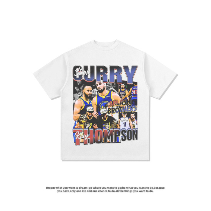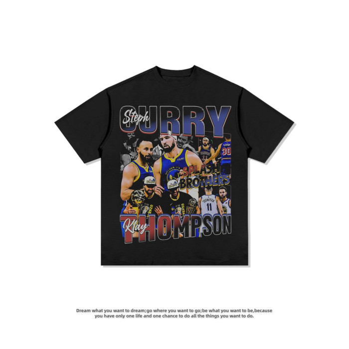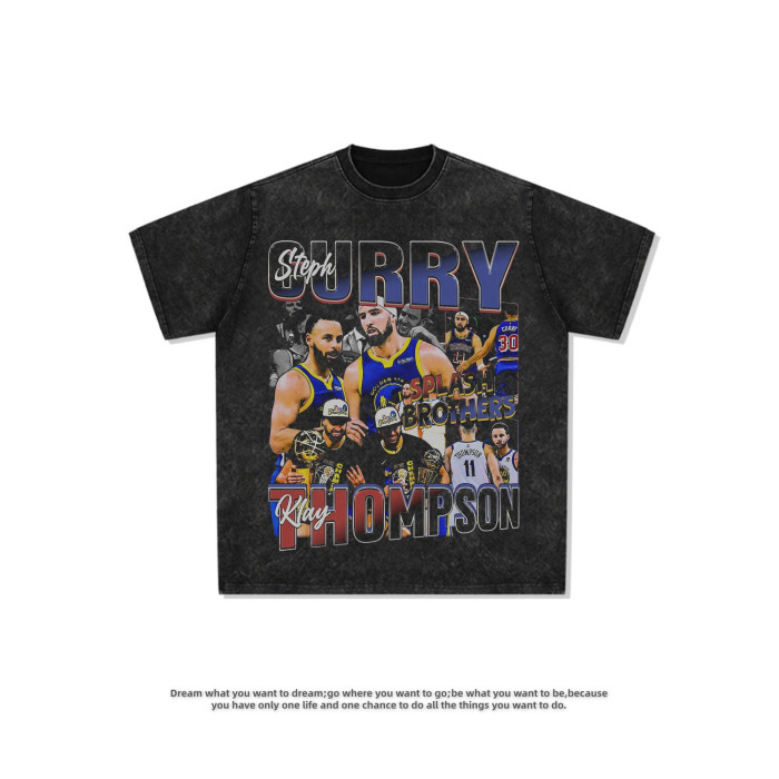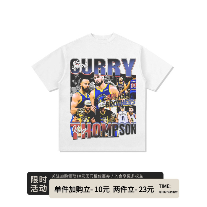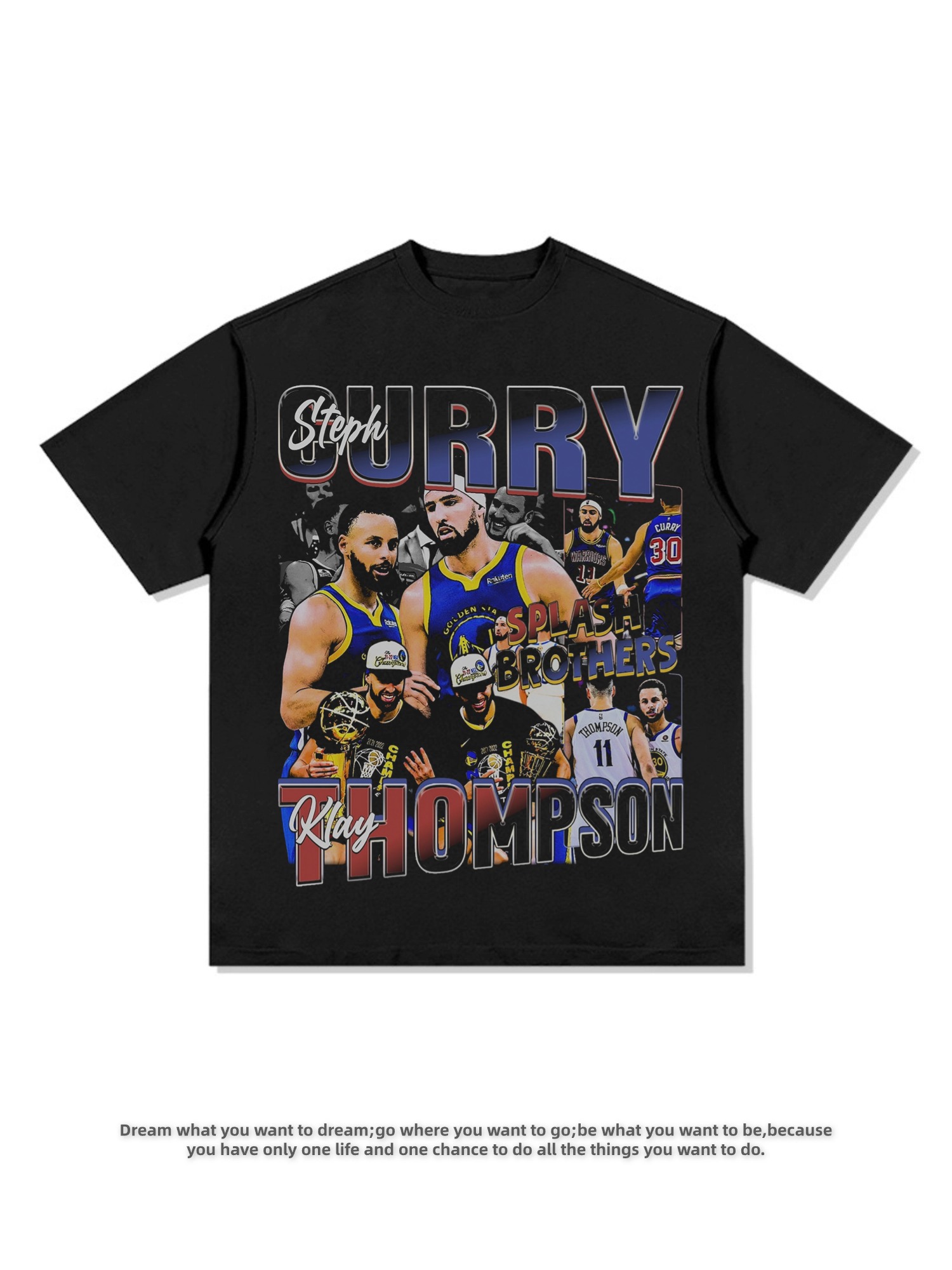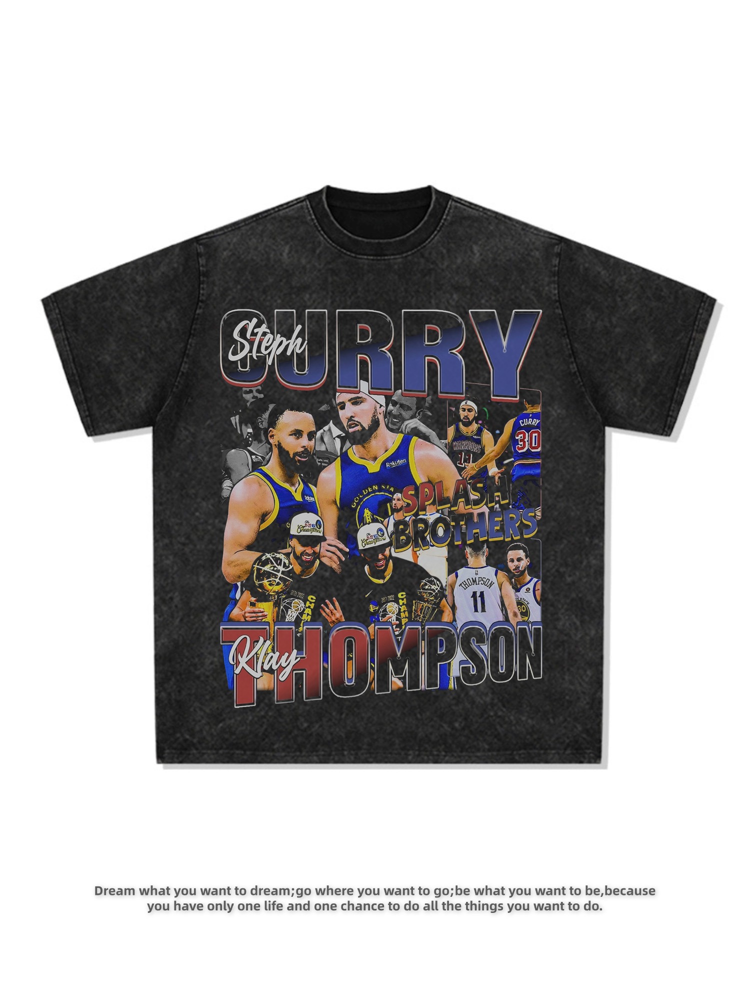 夏季水花兄弟庫里&湯普森印花短袖美式復古純棉籃球男T恤數碼噴印
