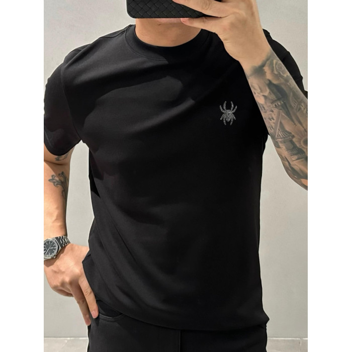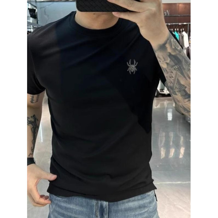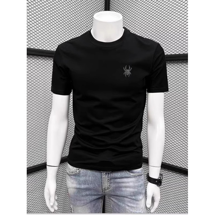 輕奢夏款燙鑽蜘蛛涼感簡約純色款修身個性圓領青年潮牌型男T恤衫