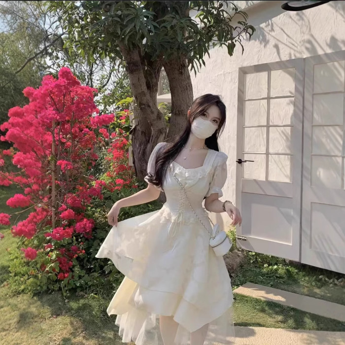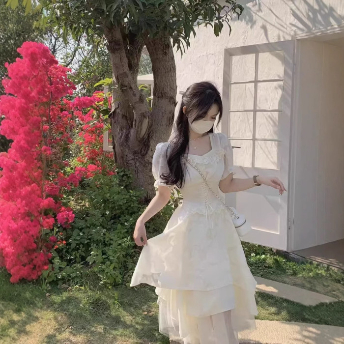 法式白色連衣裙女夏季小個子紗裙蛋糕蓬蓬公主仙女長裙裙子小白裙