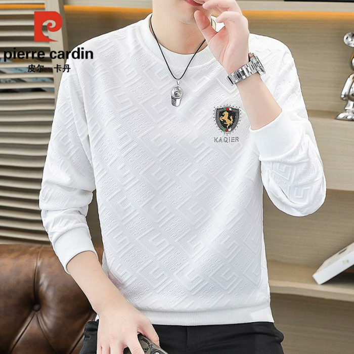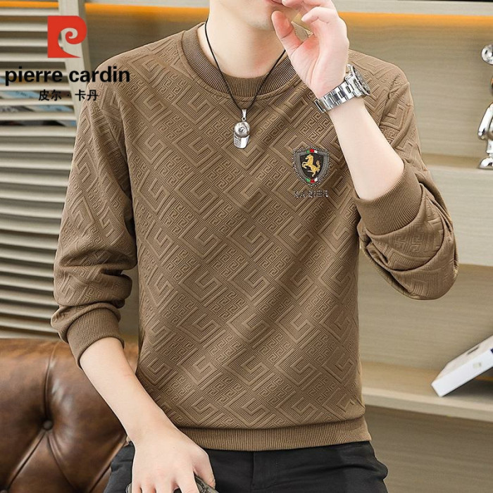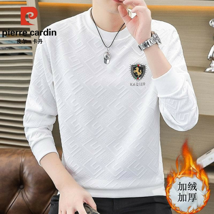皮爾卡丹長袖男t恤秋冬季加絨加厚保暖美式高級修身圓領打底衛衣