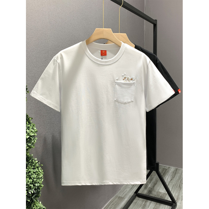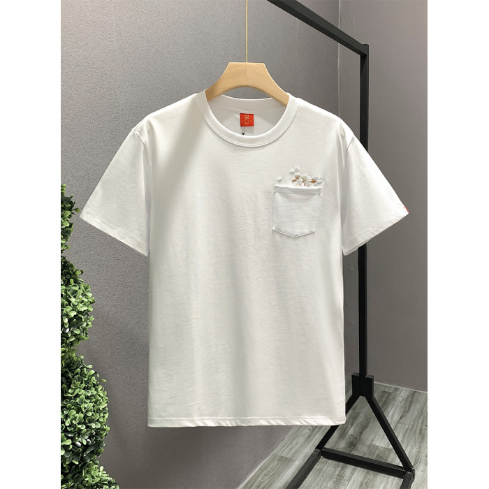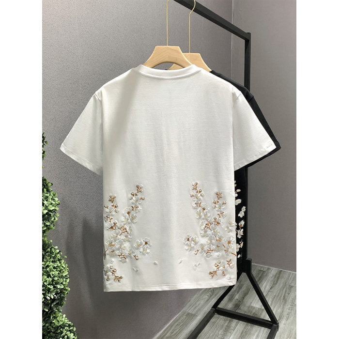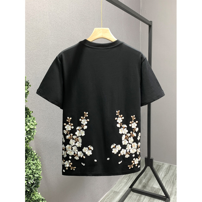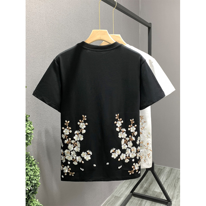 歐洲站時尚潮牌輕奢男T恤短袖梅花刺綉高級感小衆圓領半袖體恤