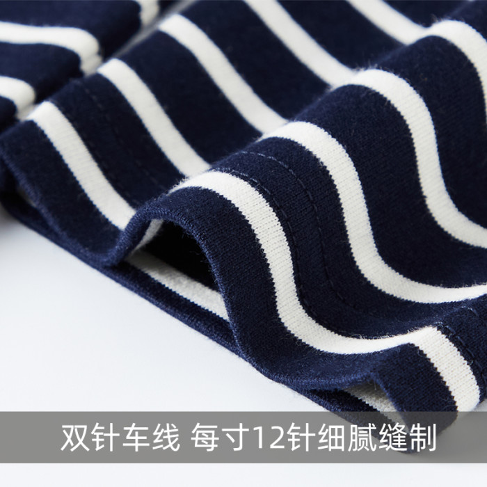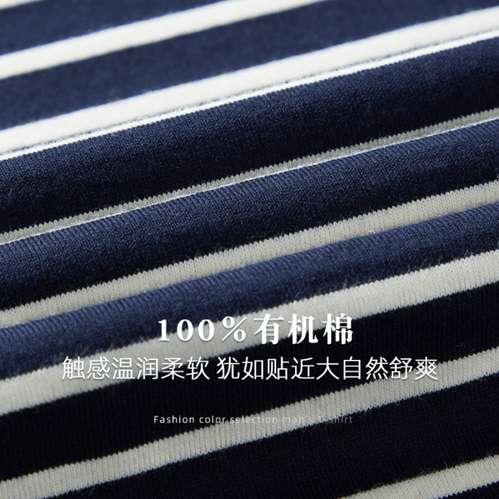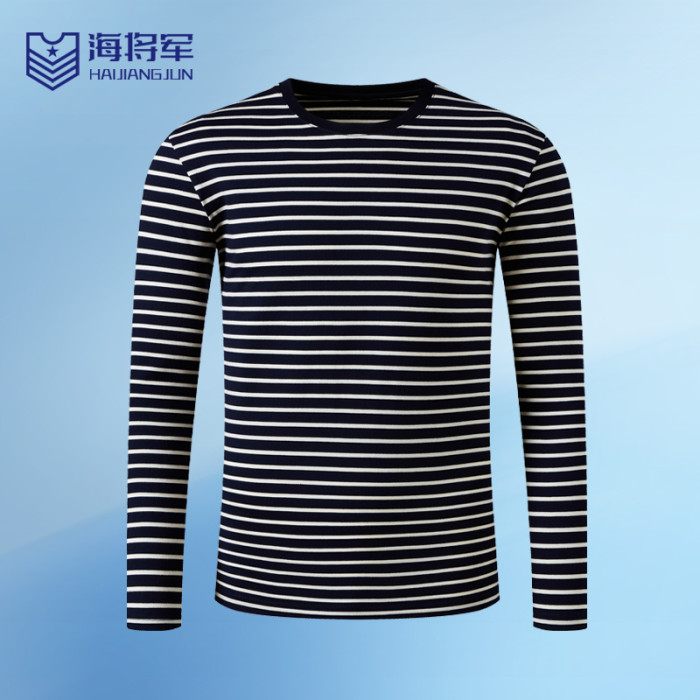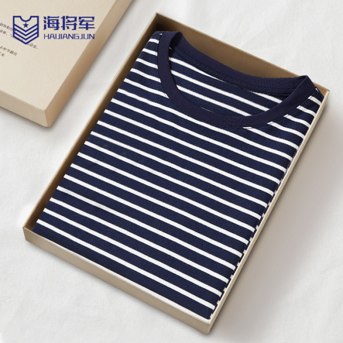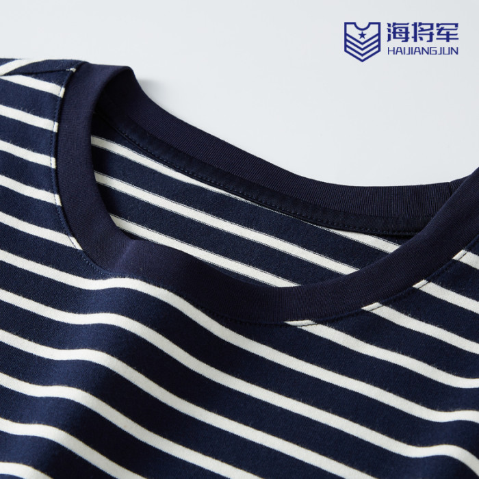 雙絲光棉深藍條紋長袖t恤t恤男士長袖高級級海魂衫女款圓領男t恤