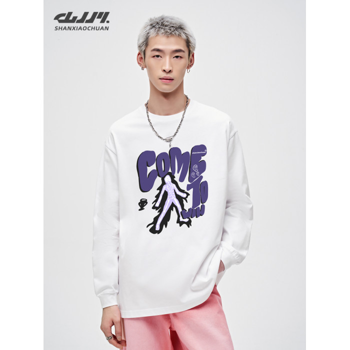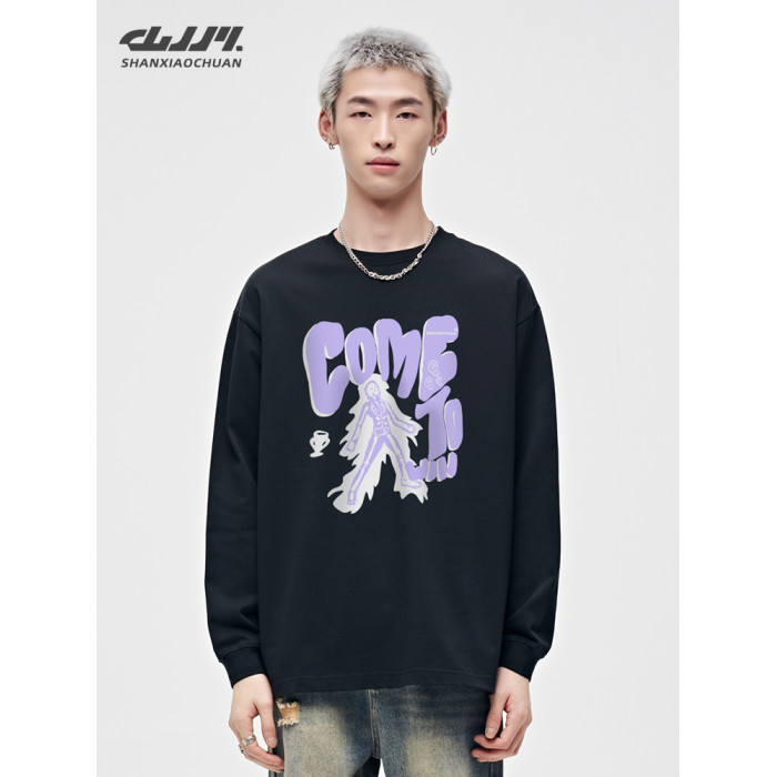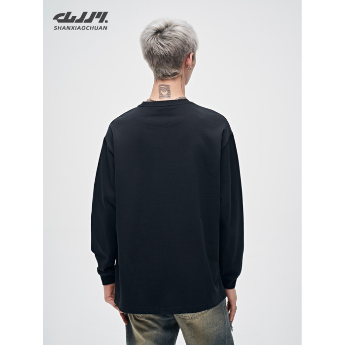 山小川長袖男t恤秋冬美式重磅純棉體恤骷髏印花tee內搭男生打底衫