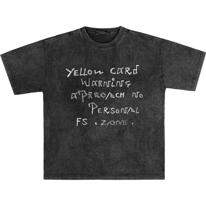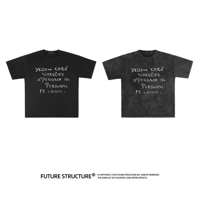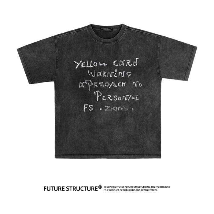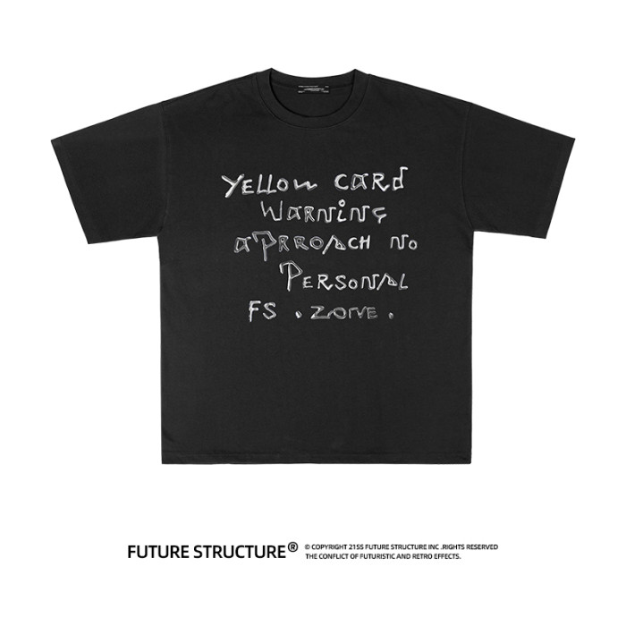 未來結搆“黃牌禁止靠近”金屬字印花短袖重磅寬松美式做舊男T恤