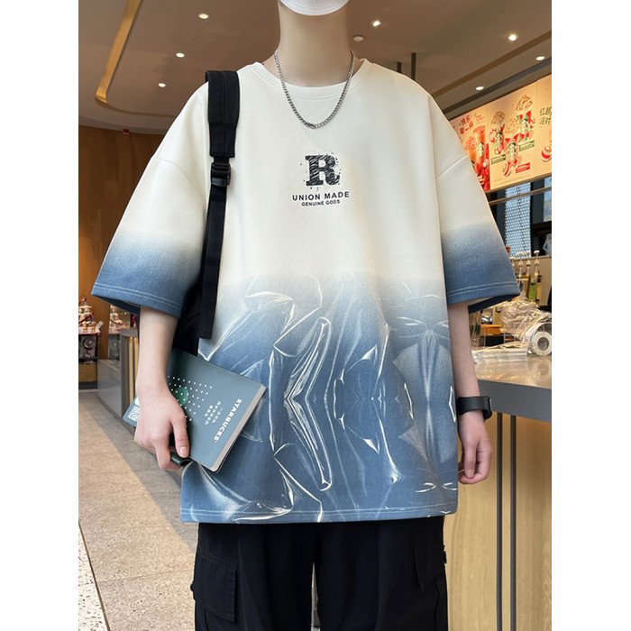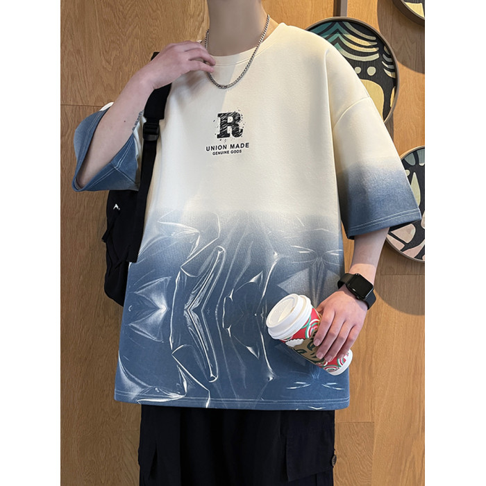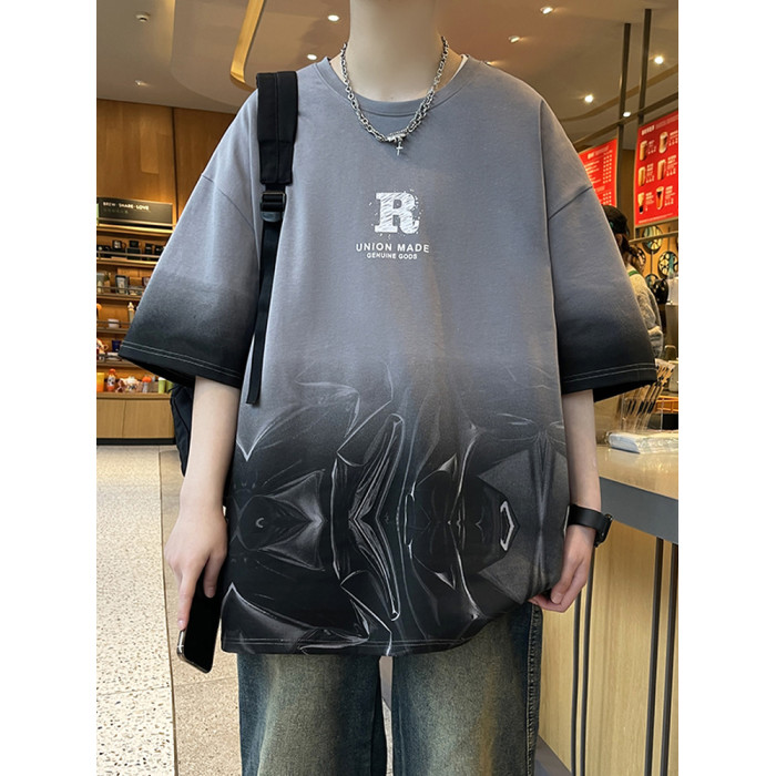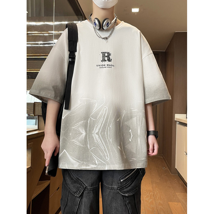 2025新款夏季印花免燙圓領落肩短袖男潮牌透氣百搭休閒寬松男T恤