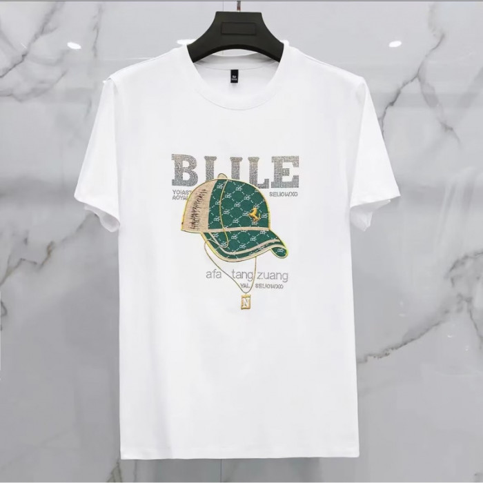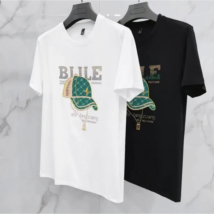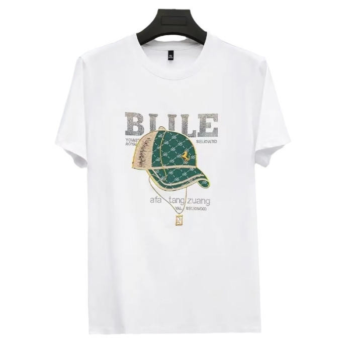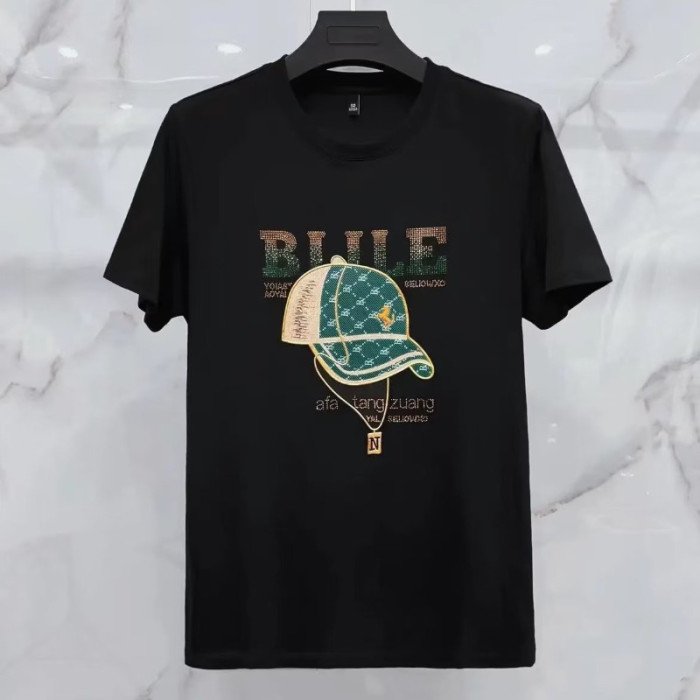 2024男裝夏新款帽子圖案燙鑽圓領T恤時尚短袖男t恤青年歐貨潮t男