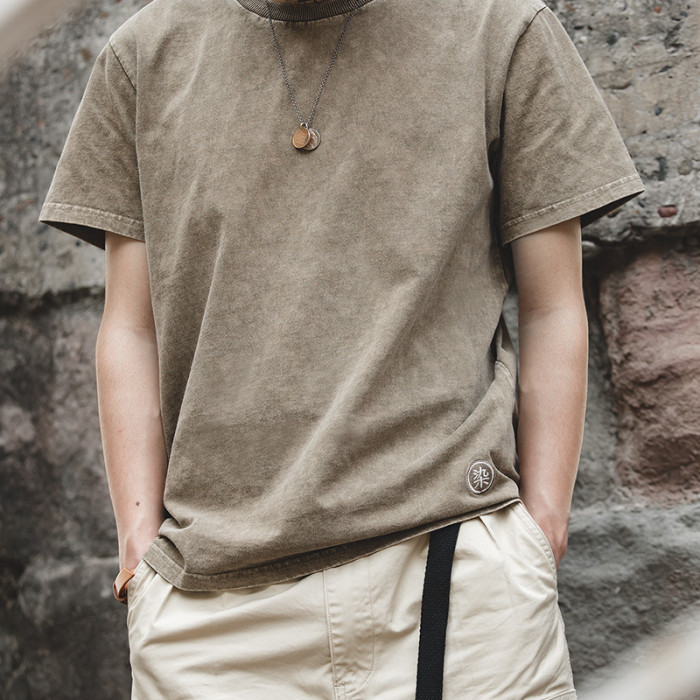 馬登工裝復古水洗做舊蠟染短Tee阿美哢嘰夏季純棉休閒半袖男T恤潮