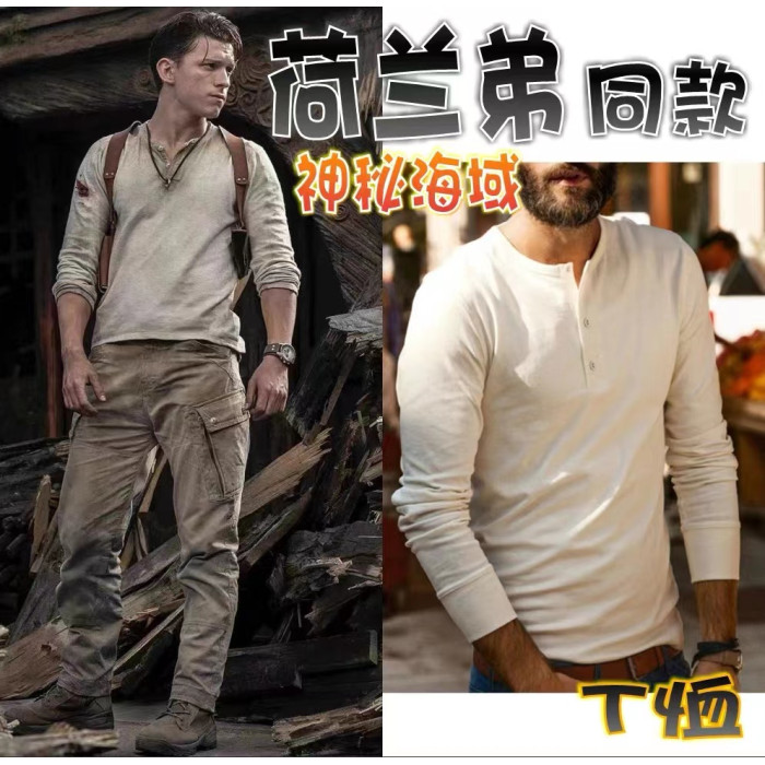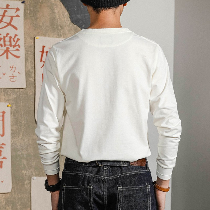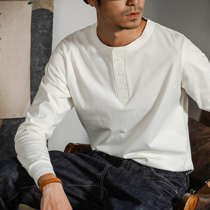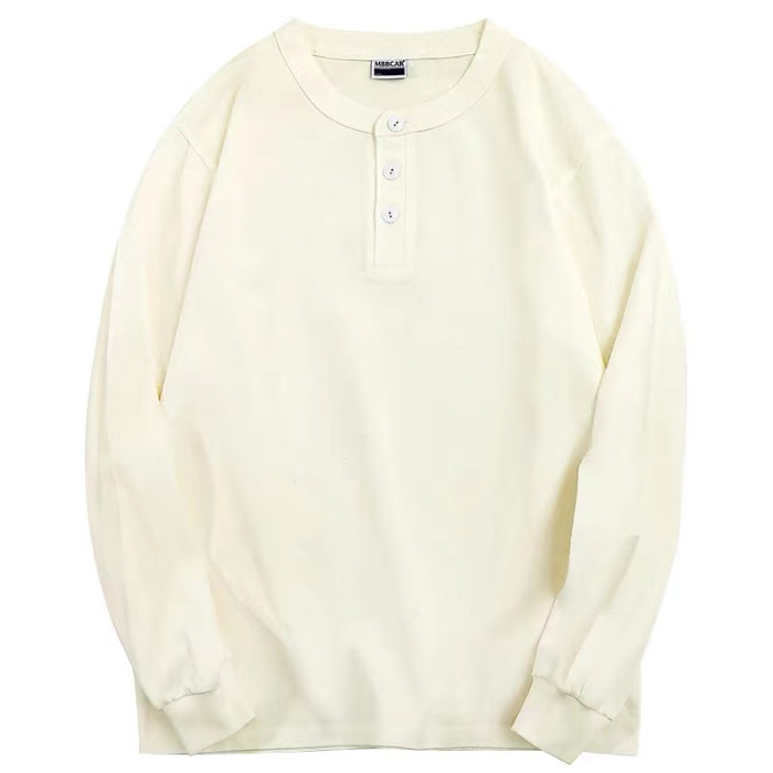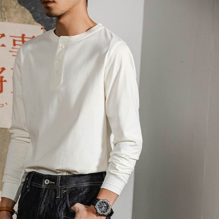 阿美哢嘰復古重磅純棉門筒領無縫不透肉亨利衫領長袖男t恤打底衫