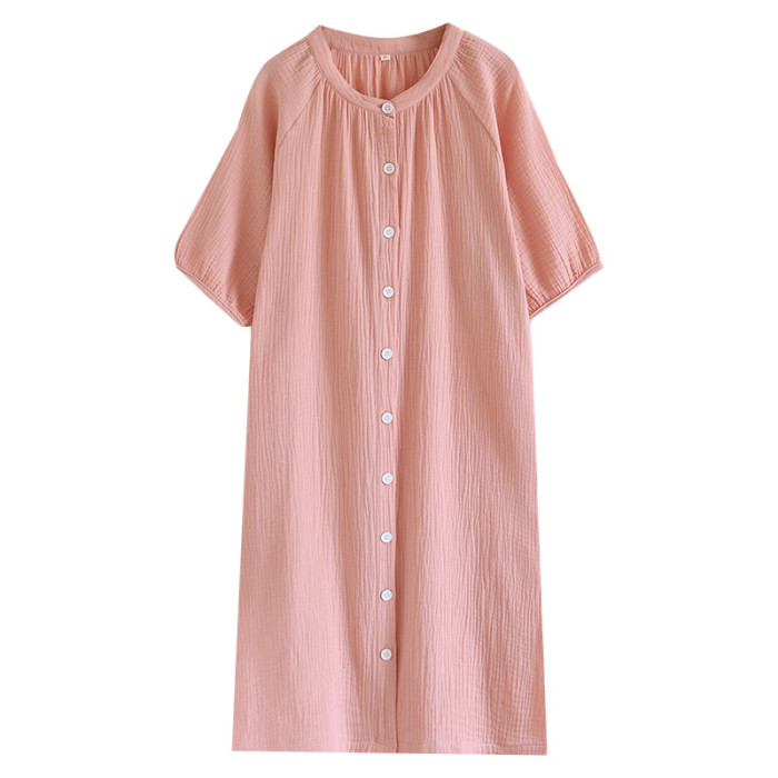 日系縐布純棉睡裙女寬松家居服夏季薄款雙層紗布家居裙開衫長裙