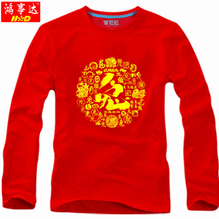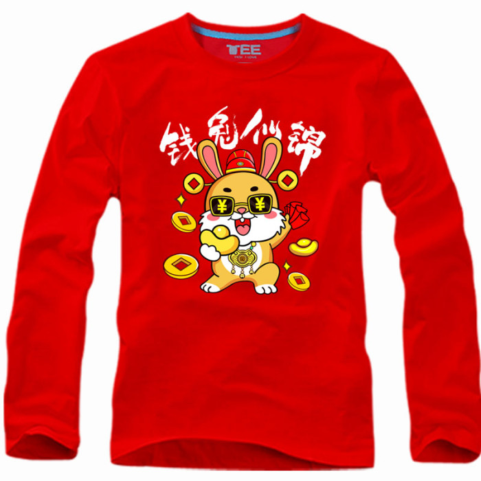 新款潮男t恤2023兔年大吉紅色本命年敭眉兔氣純棉長袖情侶裝體恤