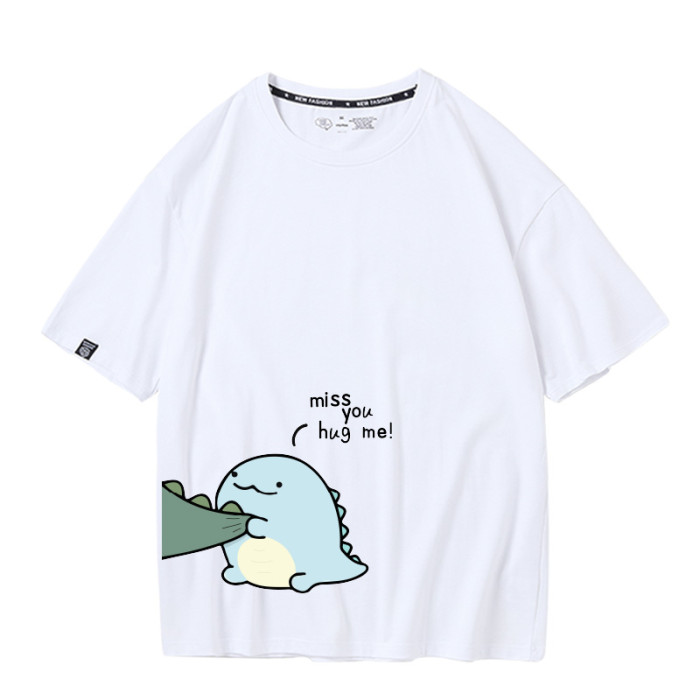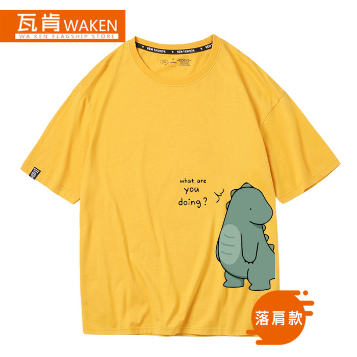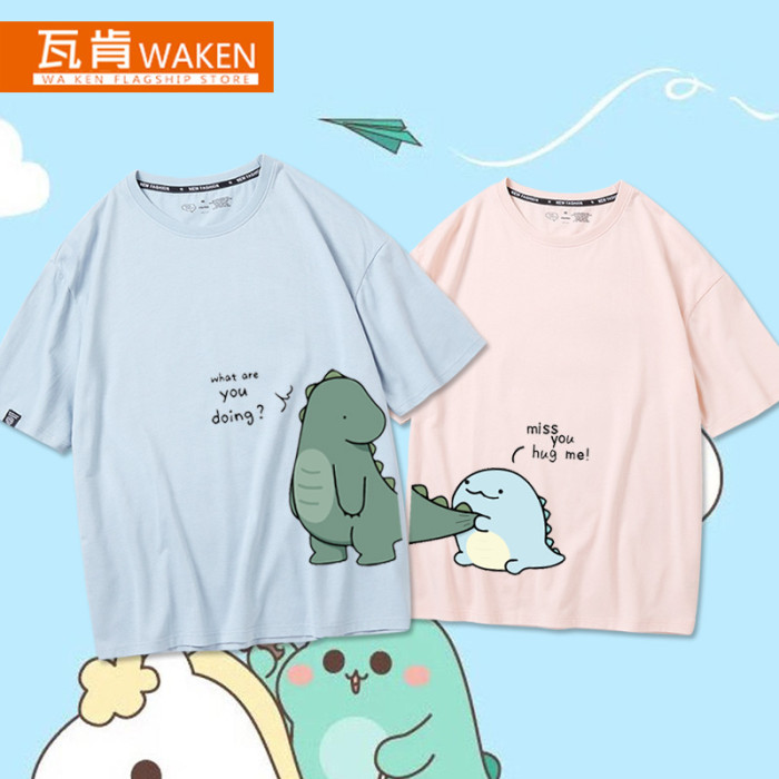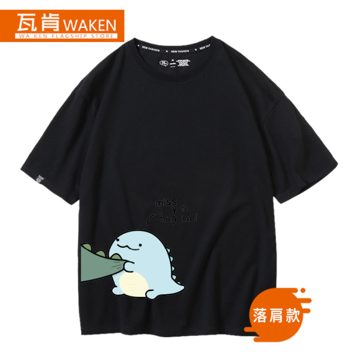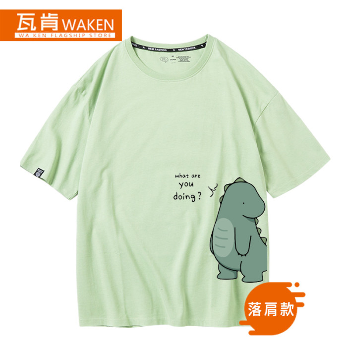 牛油果綠可愛ins潮夏季純棉短袖寬松情侶裝卡通恐龍男T恤落肩短袖