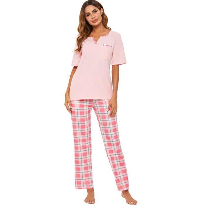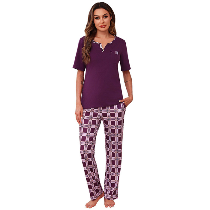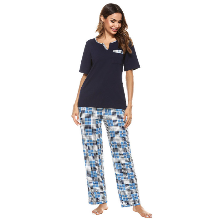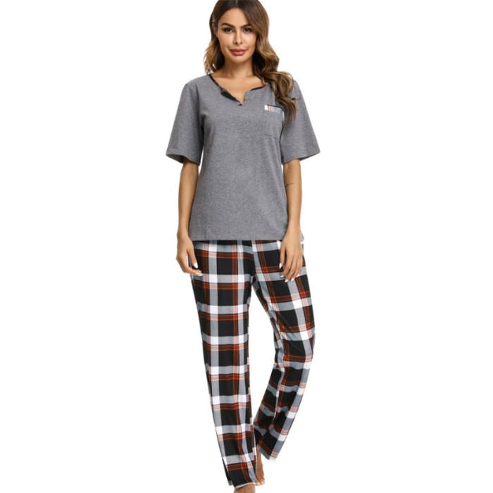 女士開領春玲短袖上衣格子印花長褲家居服睡衣套裝