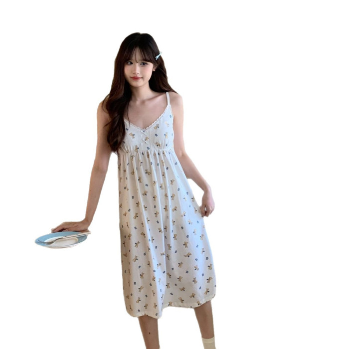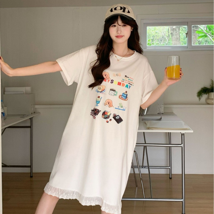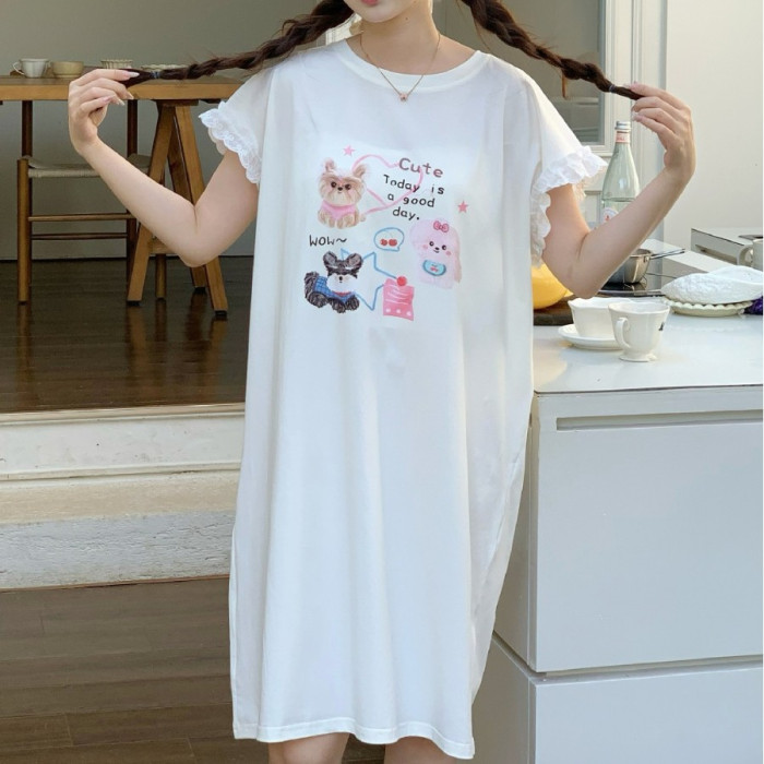新款純棉睡裙短袖卡通印花圓領中長款家居服圓領套頭可外穿