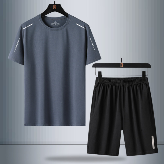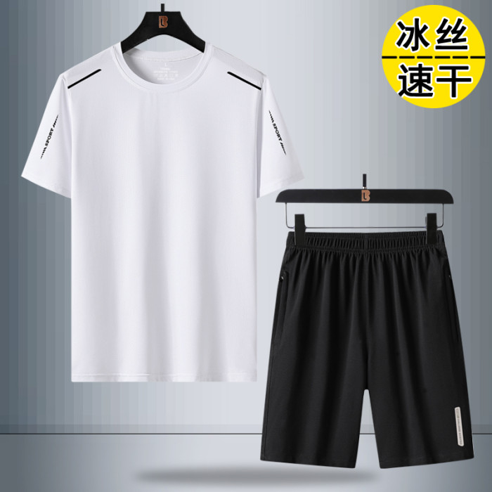 夏季短袖男t恤速乾休閒運動兩件套裝中老年冰絲父親中年爸爸男裝