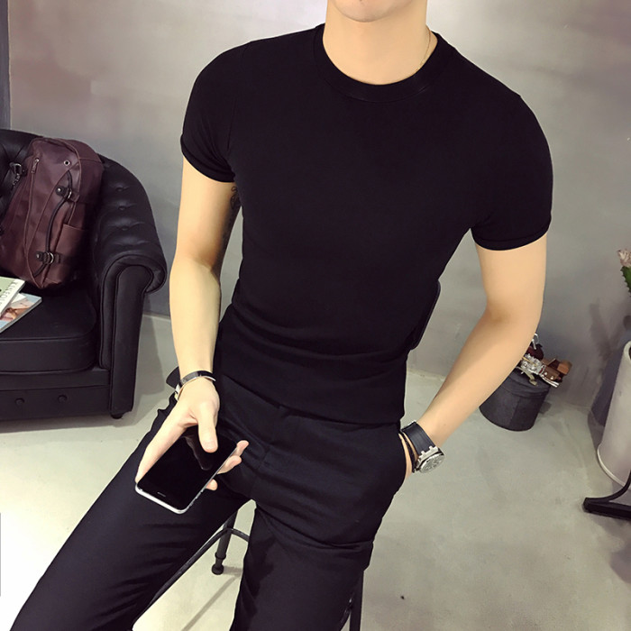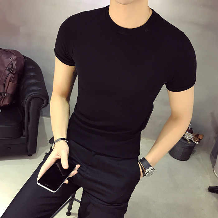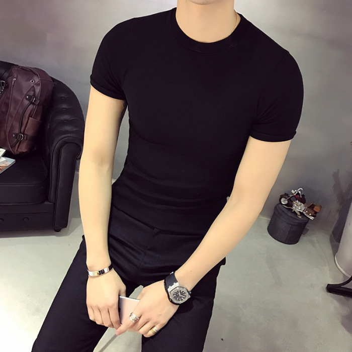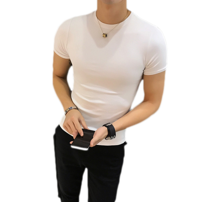 男士半袖緊身t恤白黑色健身打底夏季純棉短袖男t恤圓領韓版修身潮