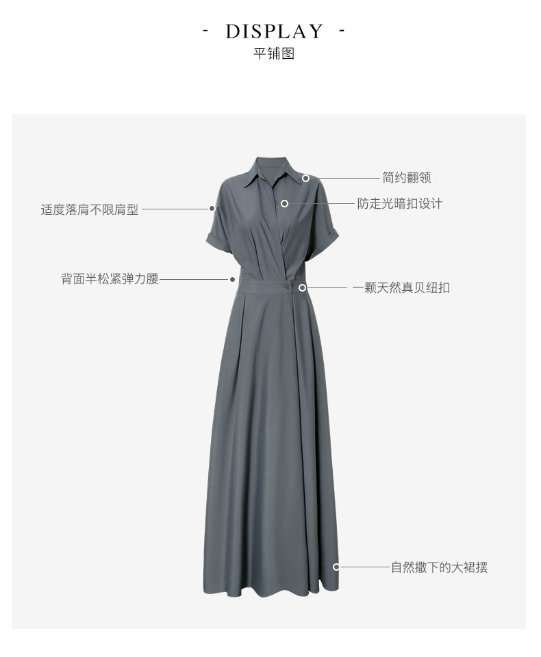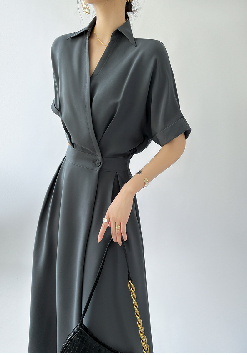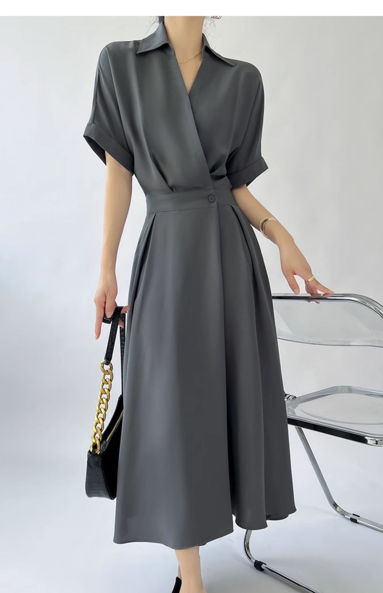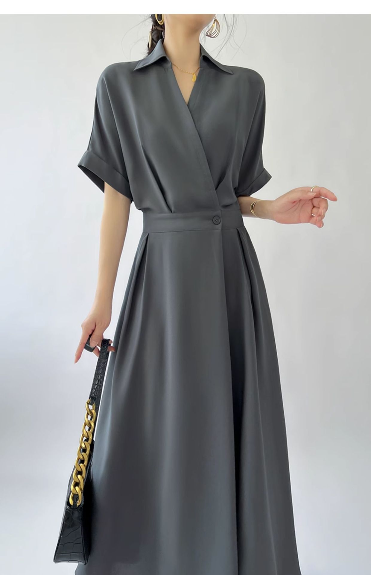 【】5501夏季冰感抗皺微胖mm中長款收腰顯瘦V領設計感連衣裙