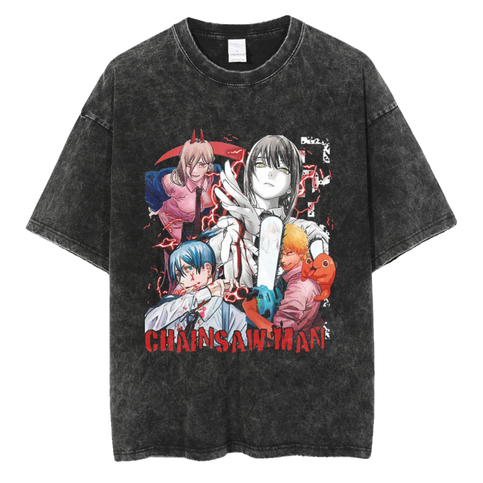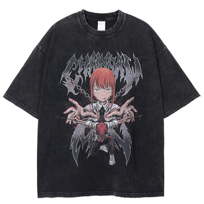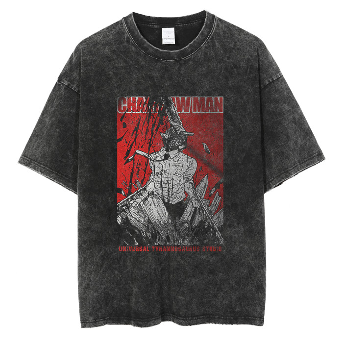 復古水洗T恤動漫電鋸人男T恤棉質夏季短袖T恤男女原宿休閒嘻哈街