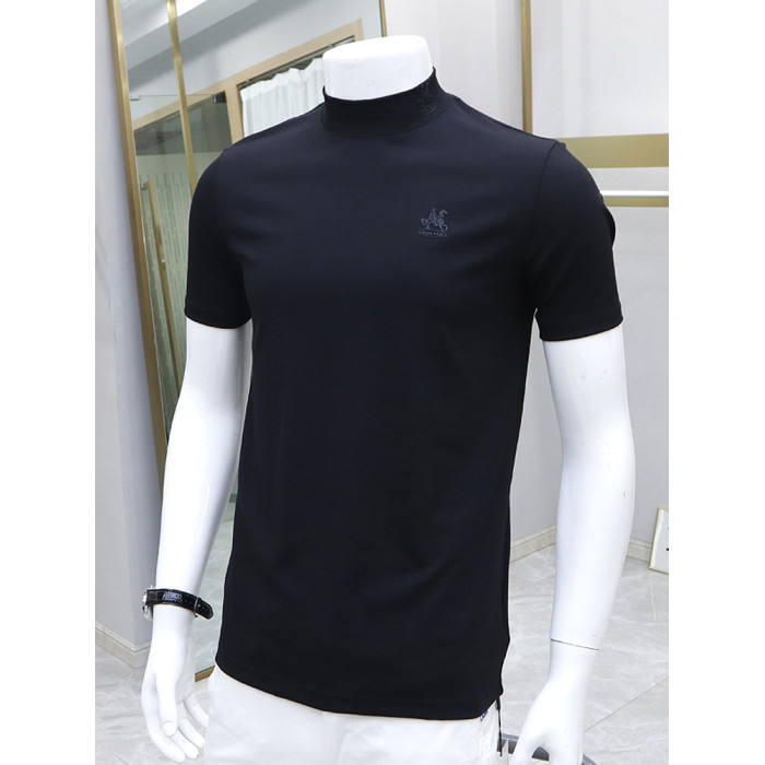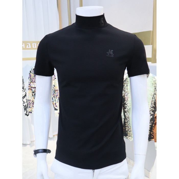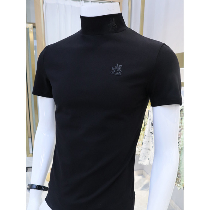 2025夏季新款重磅半高領短袖男t恤純棉韓版修身黑色中領半袖潮牌