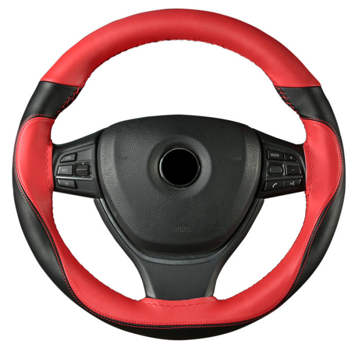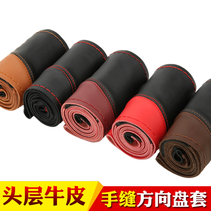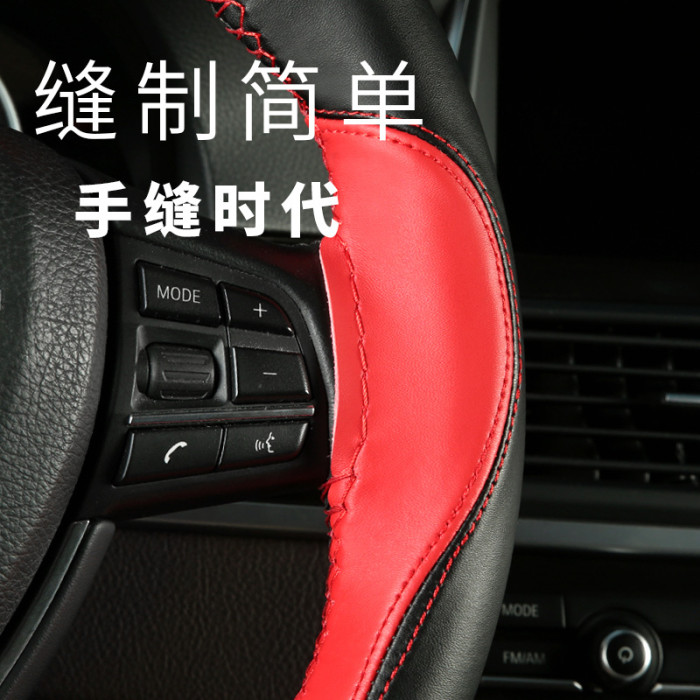 頭層牛皮拼色運動款手縫方向盤套 四季通用真皮汽車把套#1161