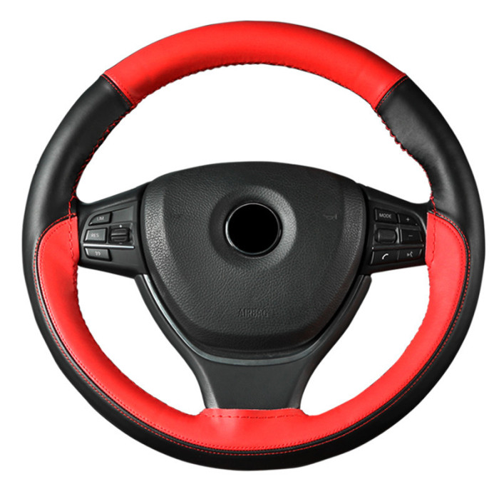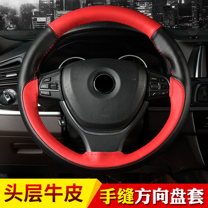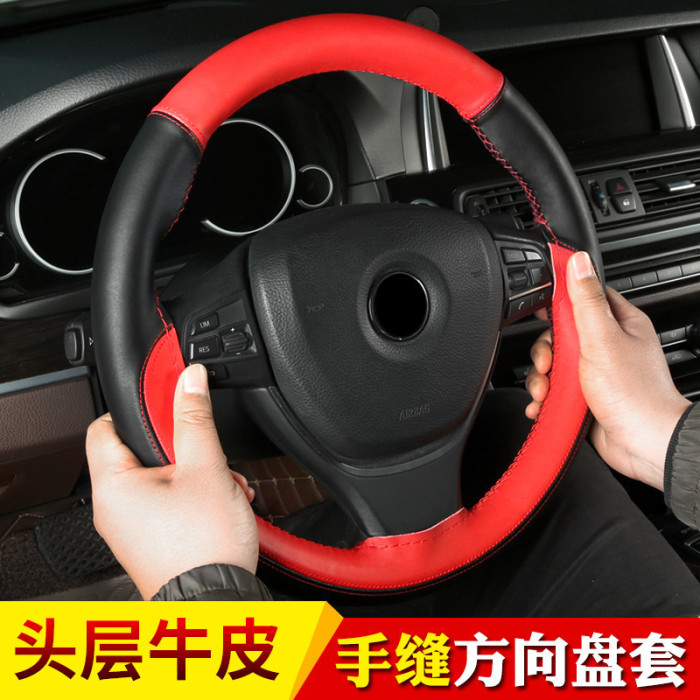 頭層牛皮拼色運動款手縫方向盤套 四季通用真皮汽車把套#1102