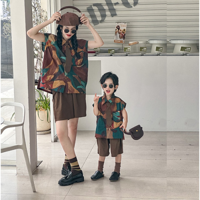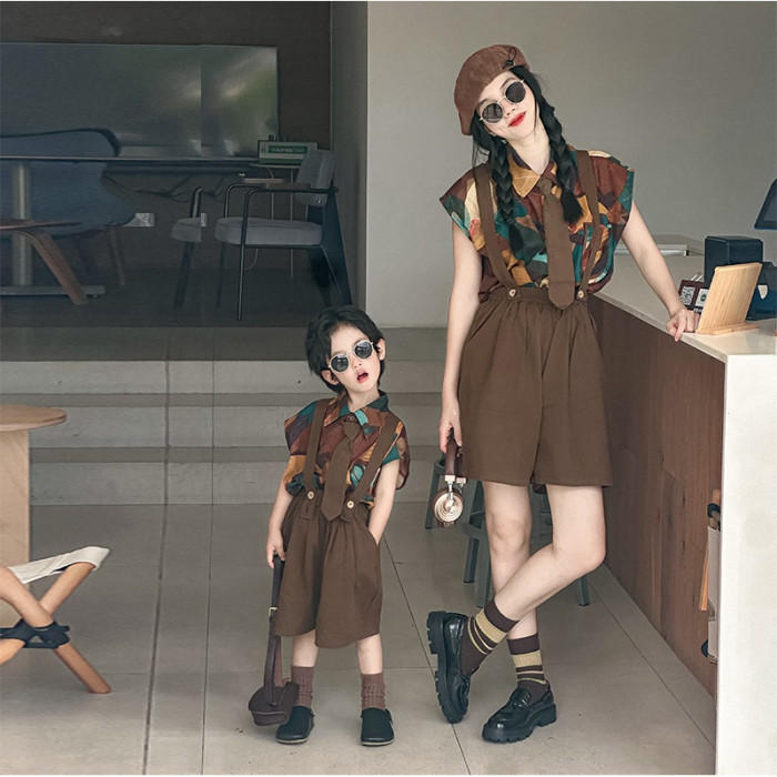 炸街親子裝夏季海邊度假風母子裝港風碎花襯衫背帶褲套裝母女裝