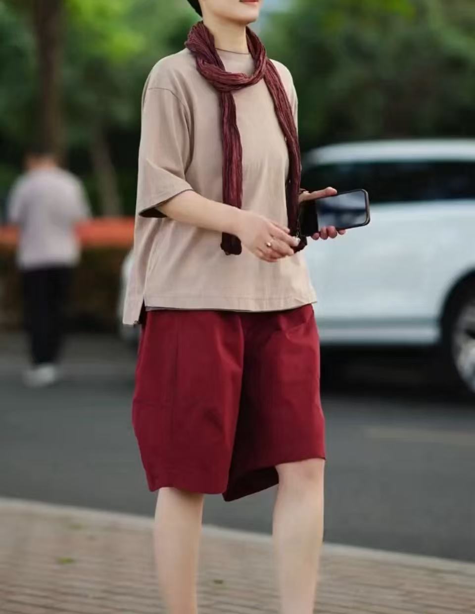 淺杏色上衣+紅色褲子