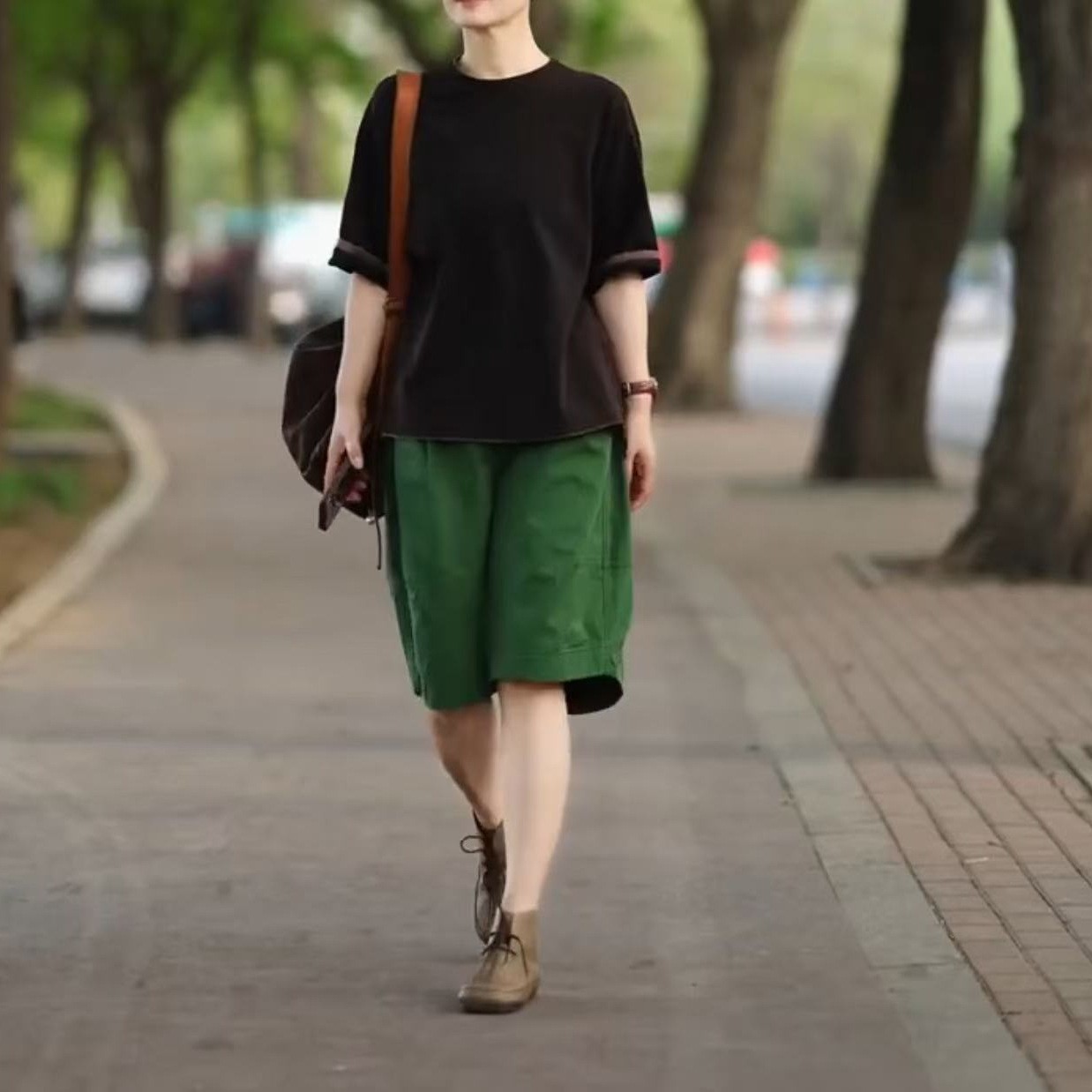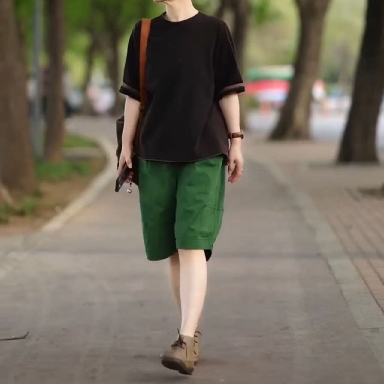 黑色上衣+綠色短褲