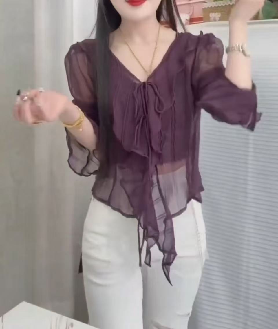 25333大愛美依緣2025夏季新款甜美荷葉邊喇叭袖上衣高腰修身褲女