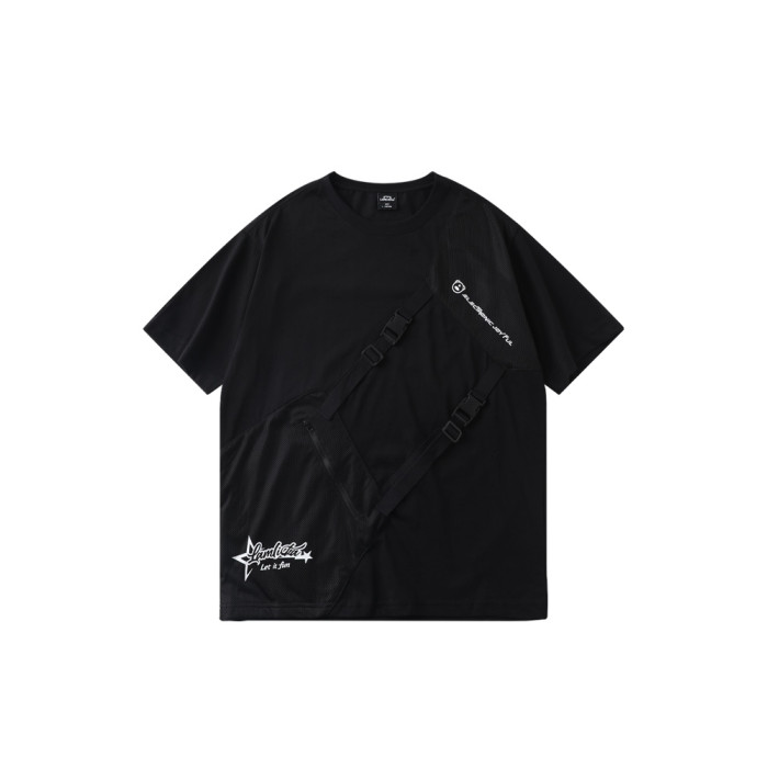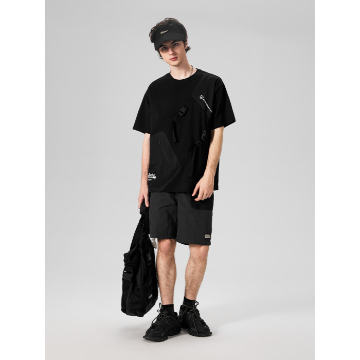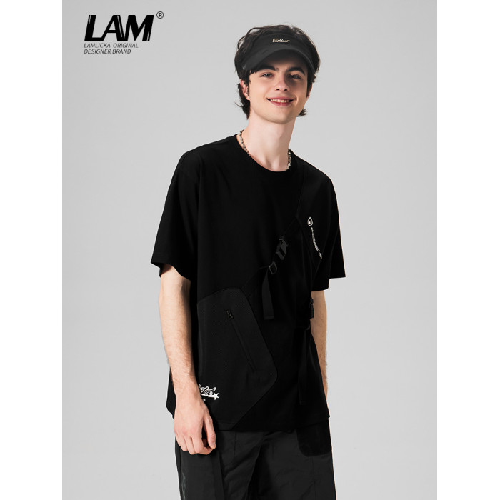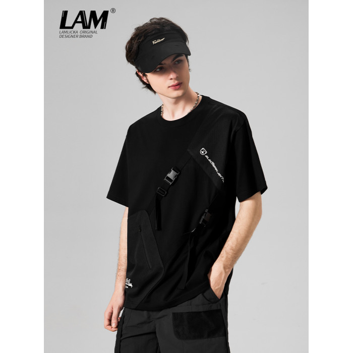 LAMLICKA日系機能風拼接圓領短袖2024新款男T恤純棉休閒體恤寬松
