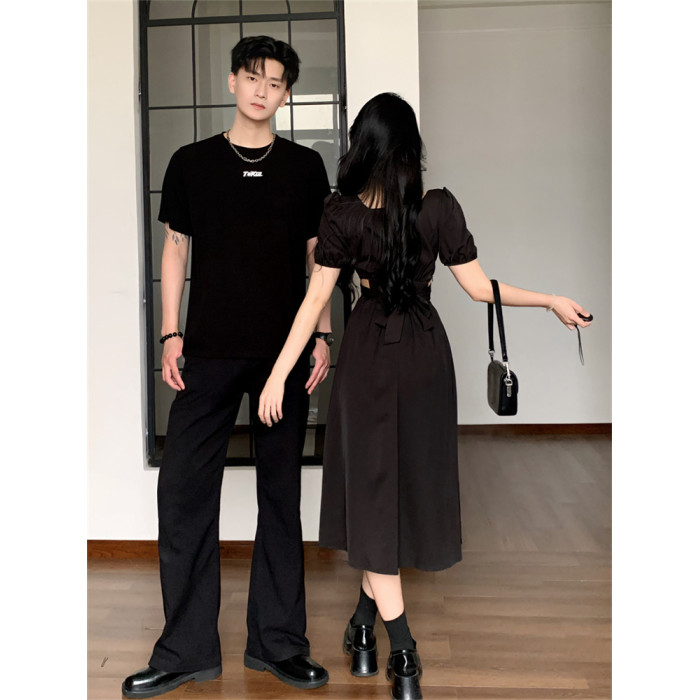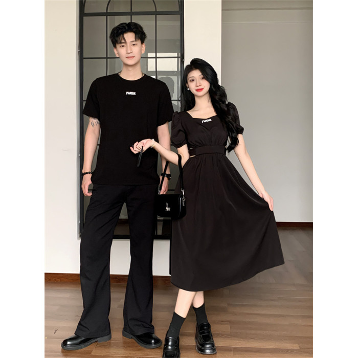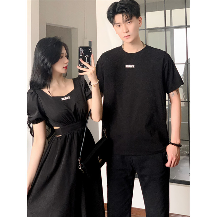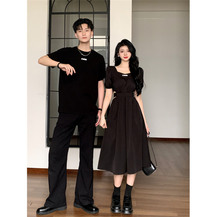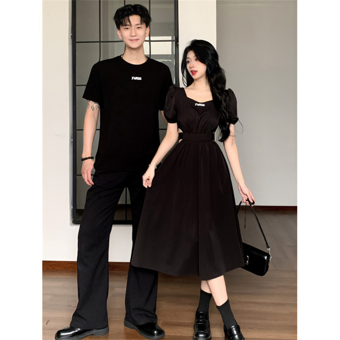 赫本風情侶裝夏裝一裙一衣高級感小衆設計感法式女連衣裙男t恤潮