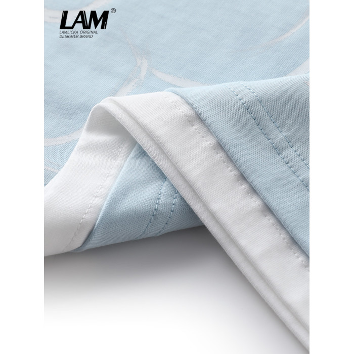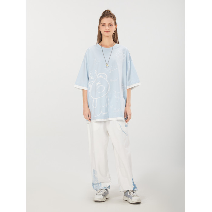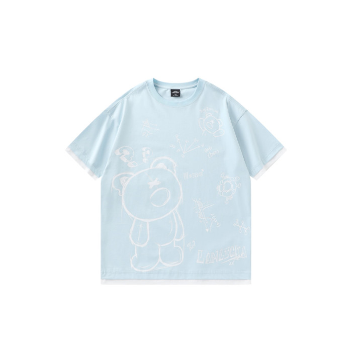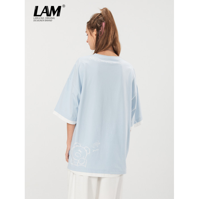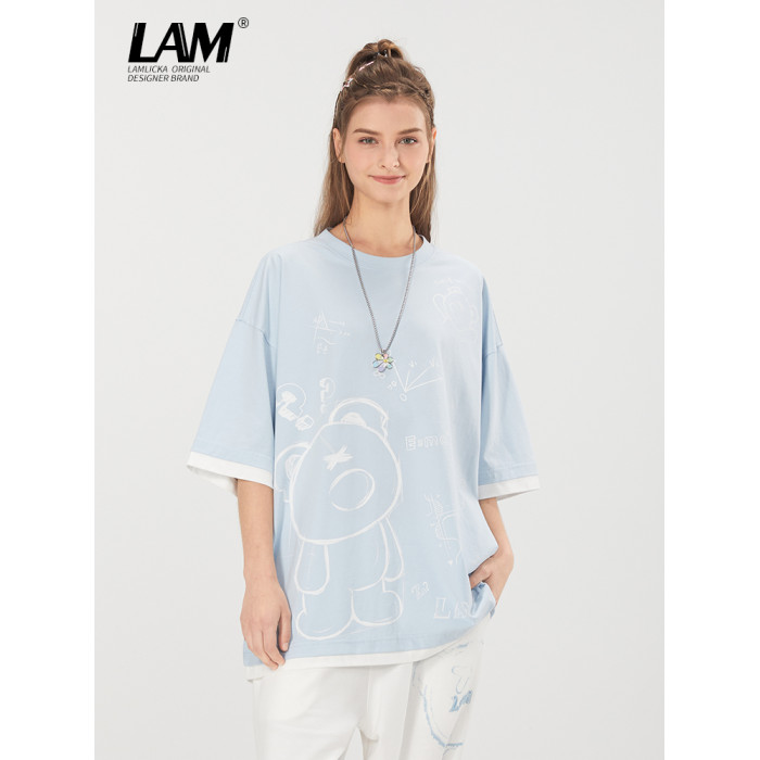 LAMLICKA假兩件短袖2024新款男T恤夏季純棉小熊情侶落肩體恤寬松