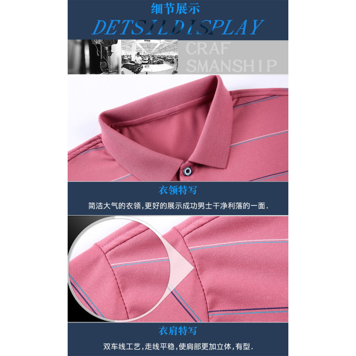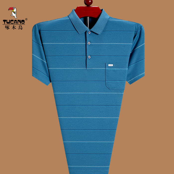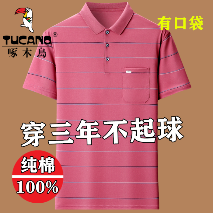 啄木鳥純棉短袖男t恤翻領爸爸裝polo衫真口袋半袖中老年條紋夏裝